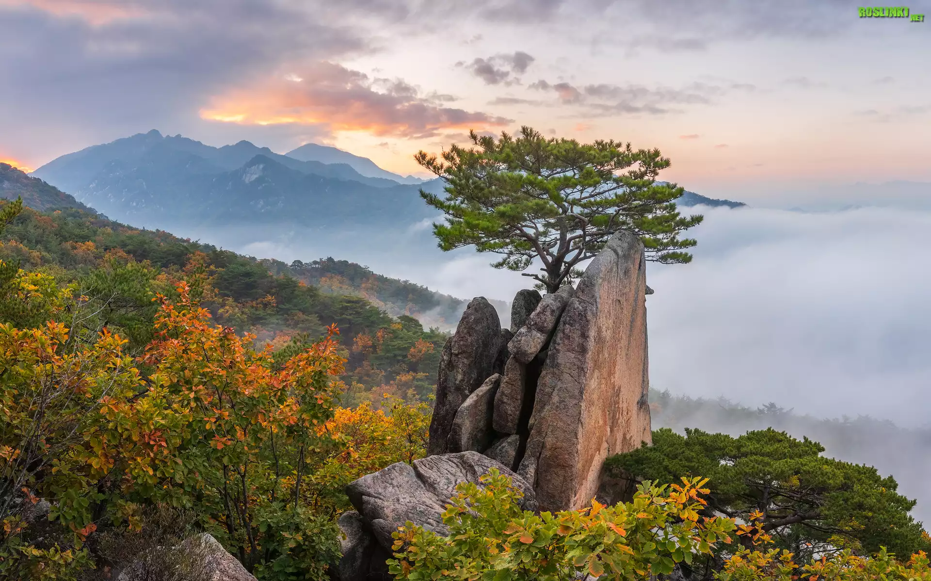 Rośliny: Góry, Drzewo, Sosna, Skała, Mgła, Niebo, Chmury, Lasy, Jesień