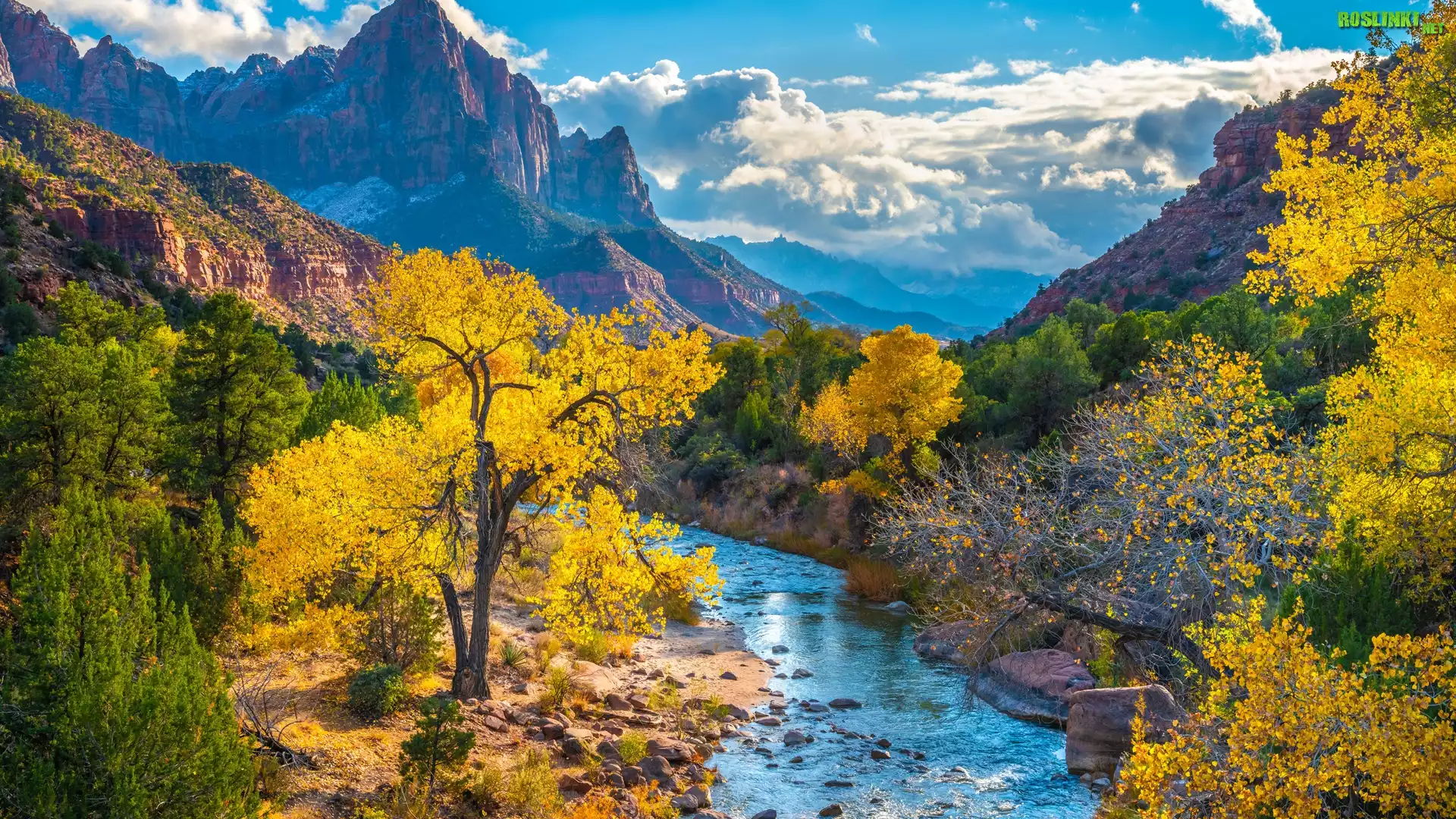 Jesień, Góry, Góra Watchman, Rzeka, Virgin River, Drzewa, Chmury, Park Narodowy Zion, Utah, Stany Zjednoczone |