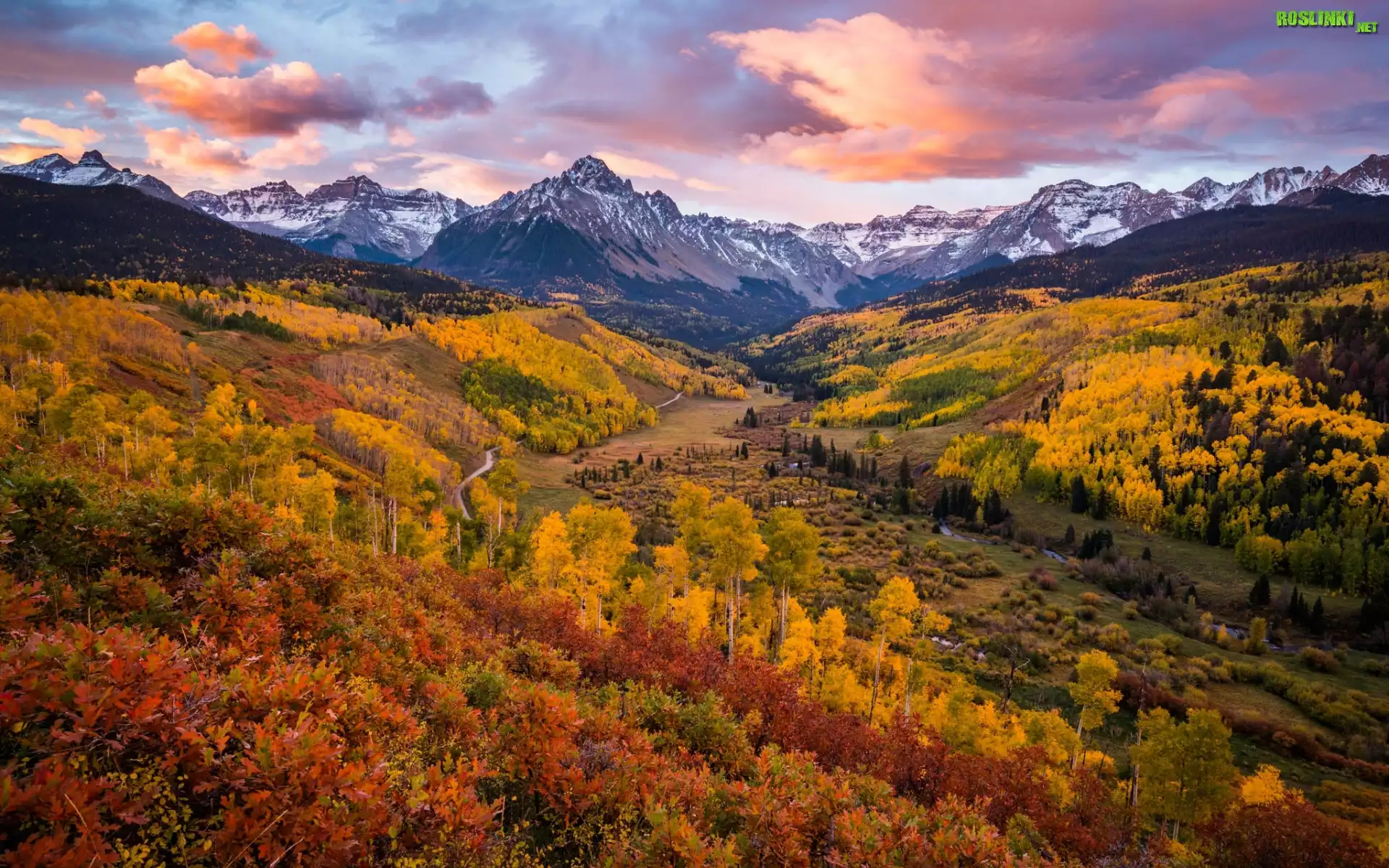 Jesień, Chmury, Góry, San Juan Mountains, Góra, Mount Sneffels, Dolina, Las, Kolorowe, Drzewa, Kolorado, Stany Zjednoczone |
