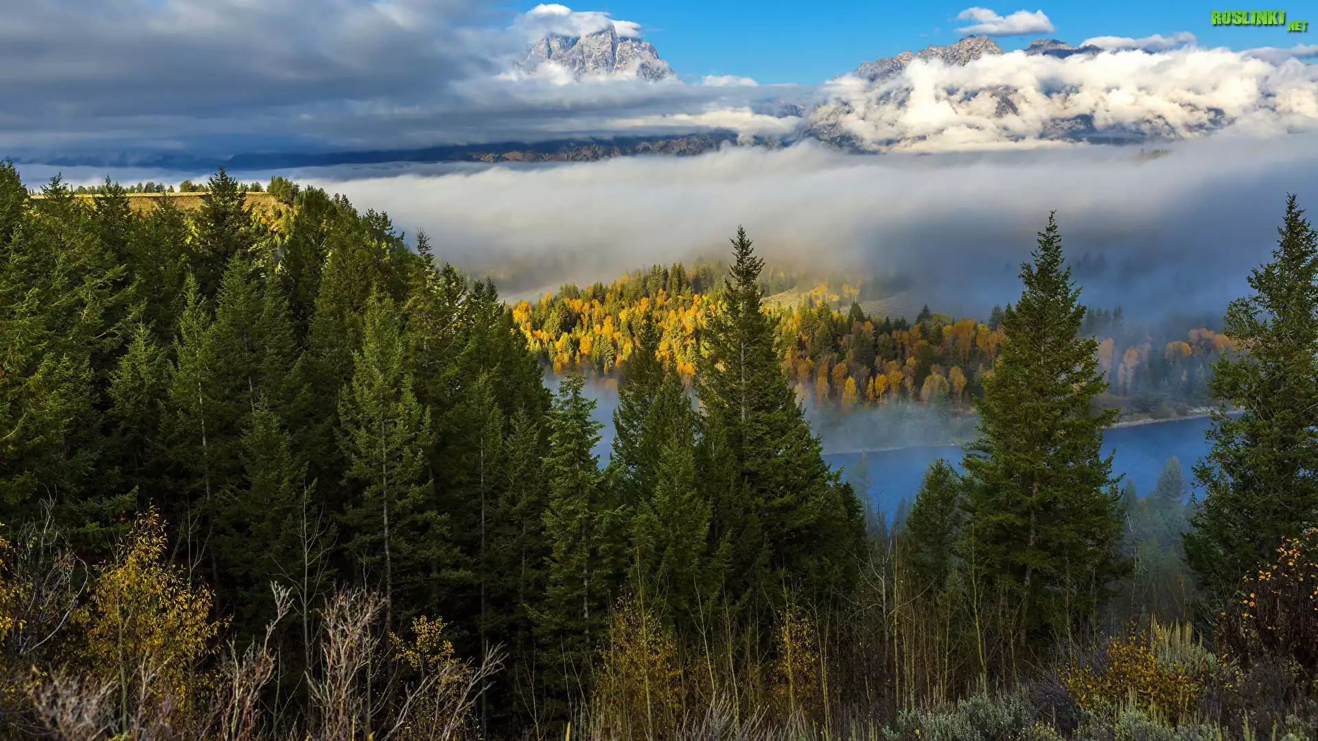 Jesień, Las, Góry, Drzewa, Świerki, Mgła, Krajobraz, Park Narodowy Grand Teton, Stan Wyoming, Stany Zjednoczone |