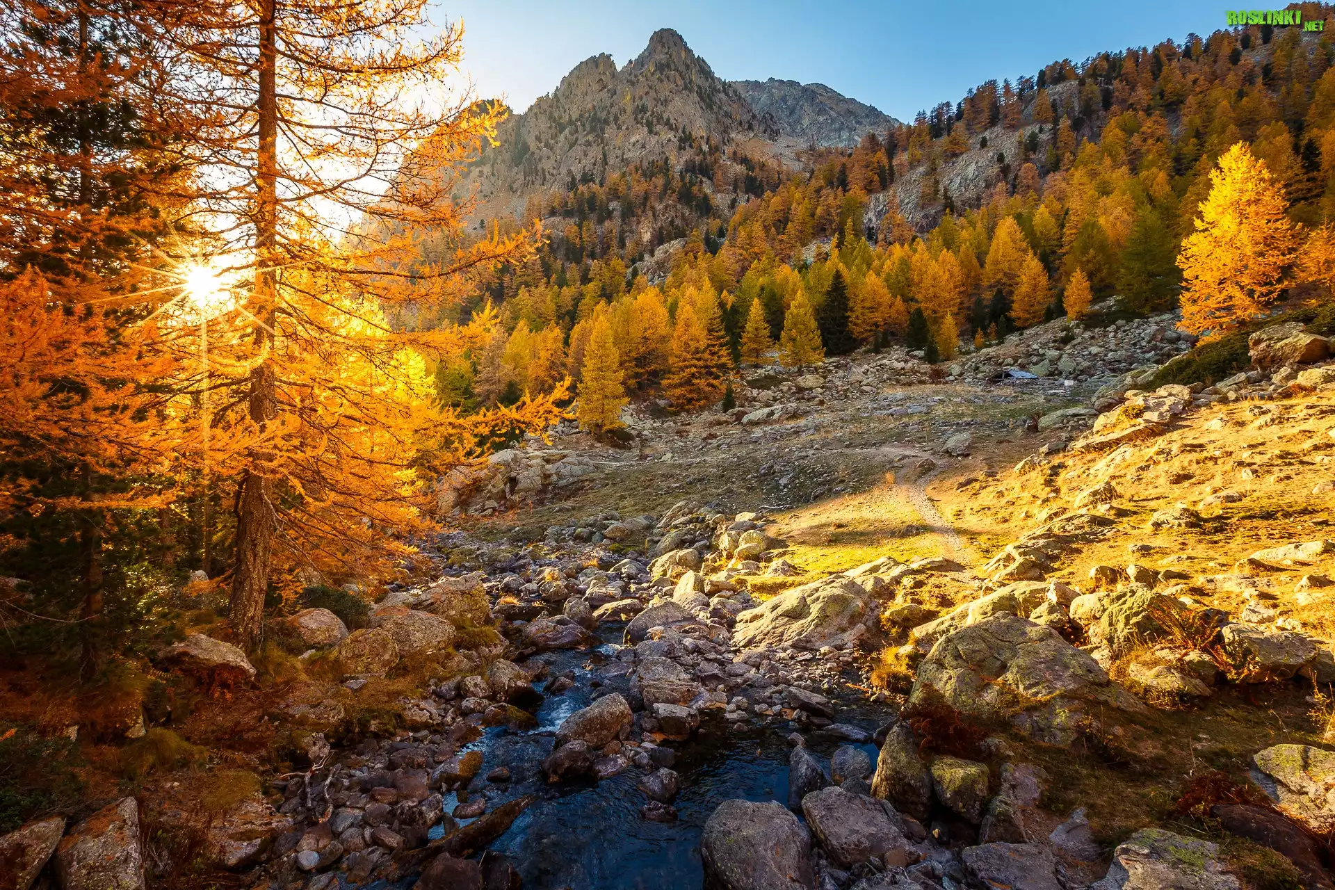 Rośliny: Góry, Drzewa, Stok, Kamienie, Gałęzie, Promienie słońca, Jesień