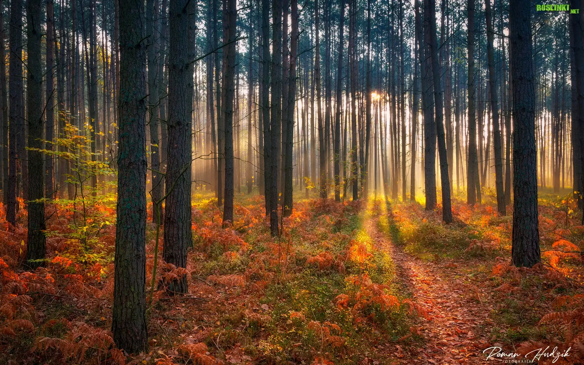 Las, Drzewa, Roślinność, Jesień, Przebijające światło