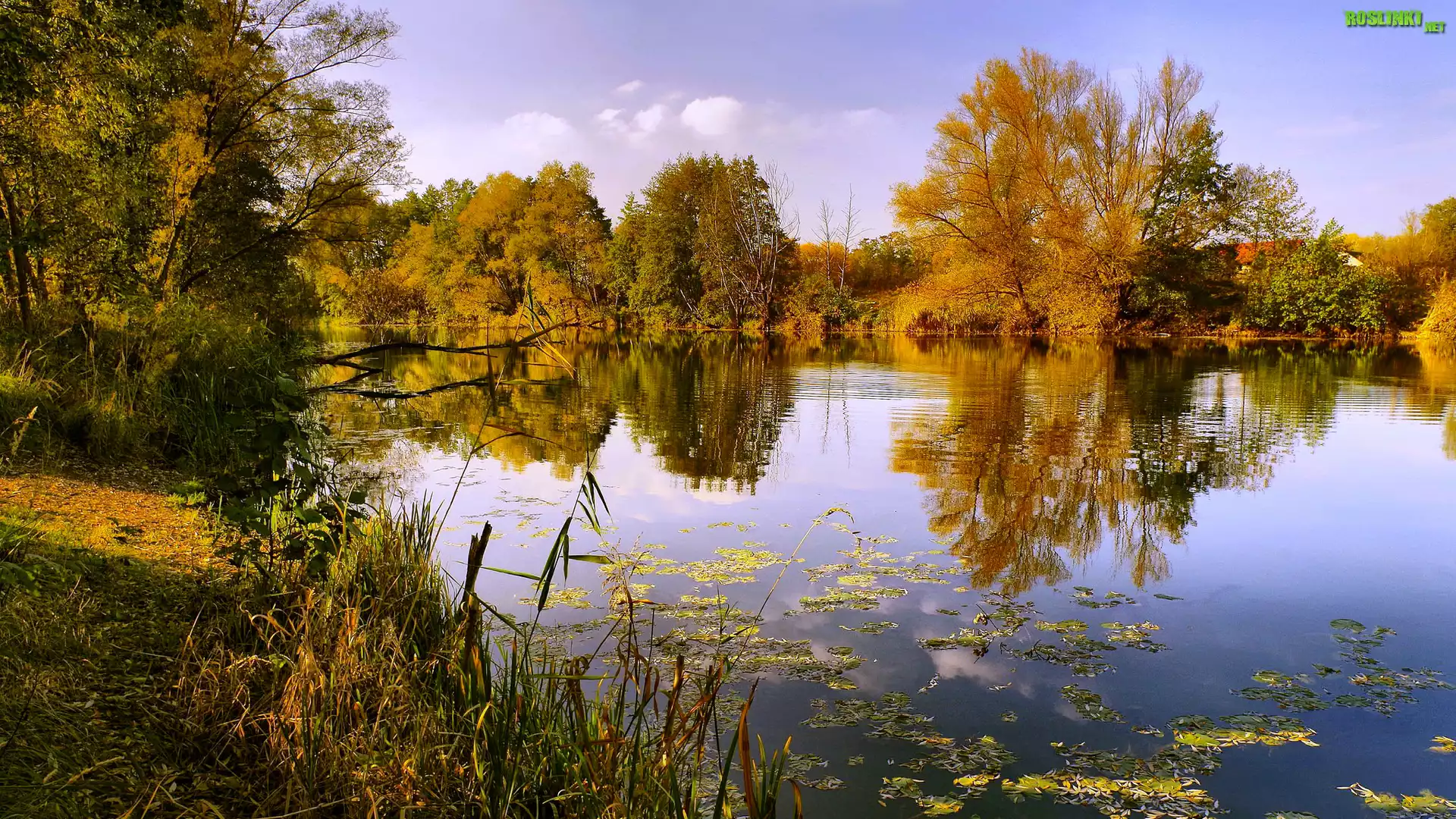 Rośliny: Jesień, Jezioro, Drzewa, Trzciny, Odbicie