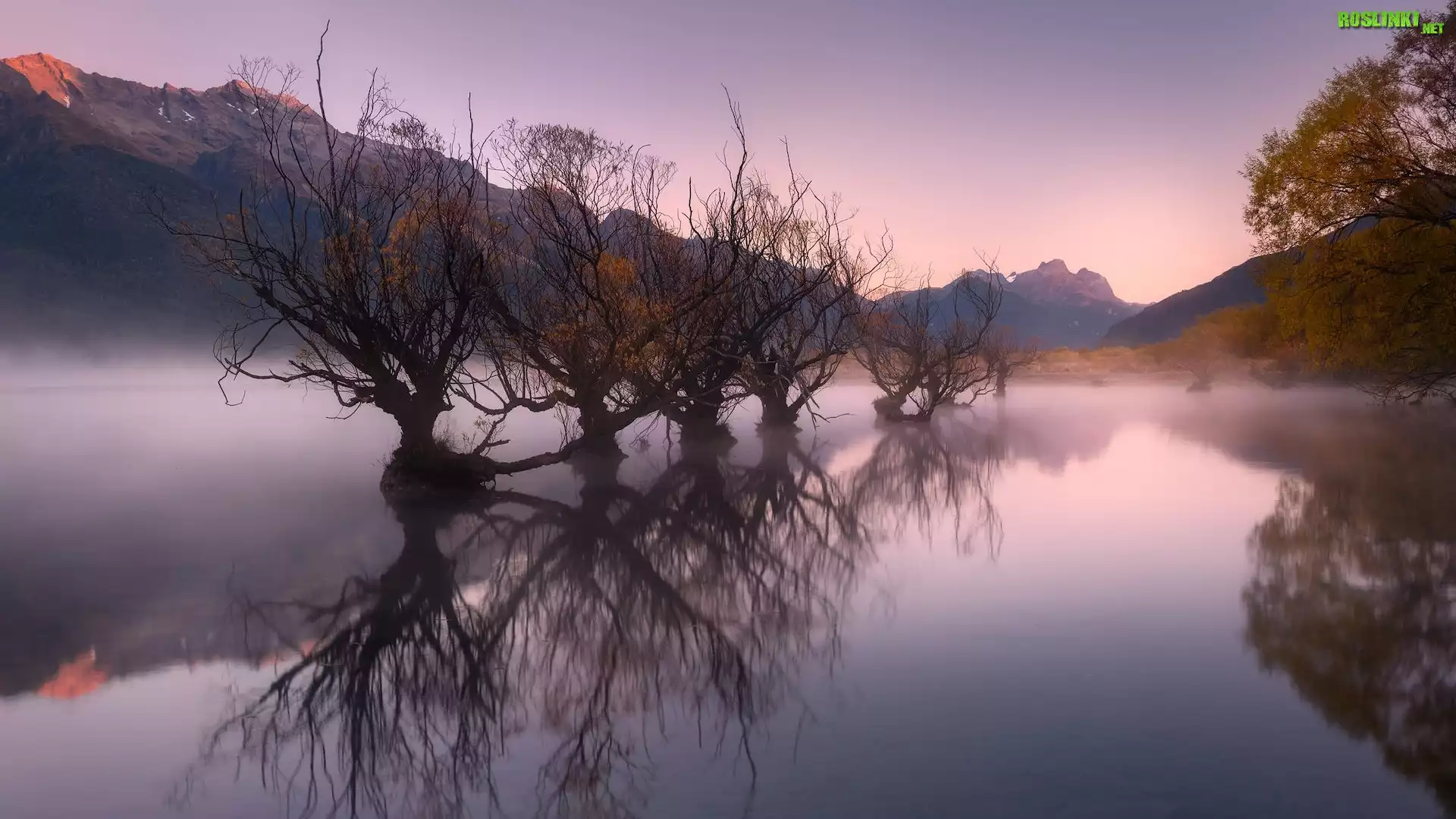 Wschód słońca, Jezioro, Wakatipu, Jesień, Rząd, Drzewa, Wierzby, Odbicie, Mgła, Glenorchy, Queenstown, Nowa Zelandia |