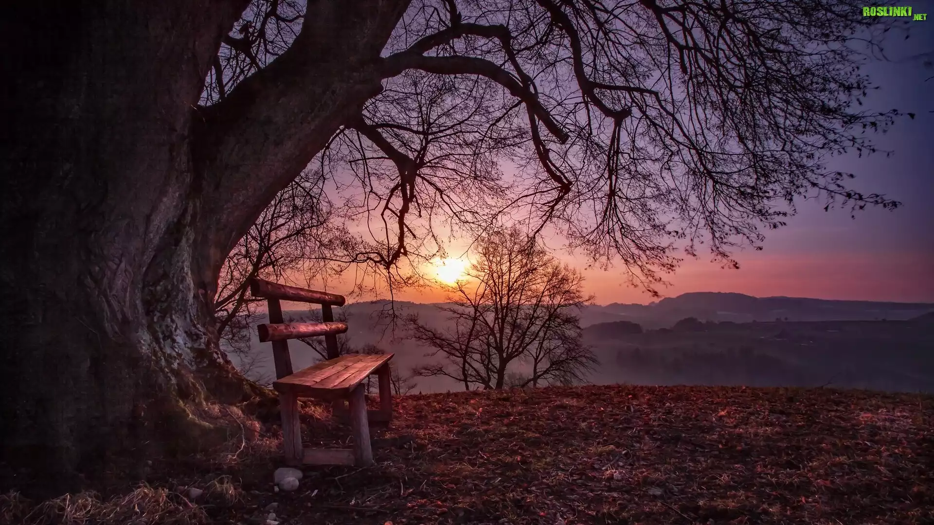 Rośliny: Jesień, Drzewo, Ławka, Zachód słońca