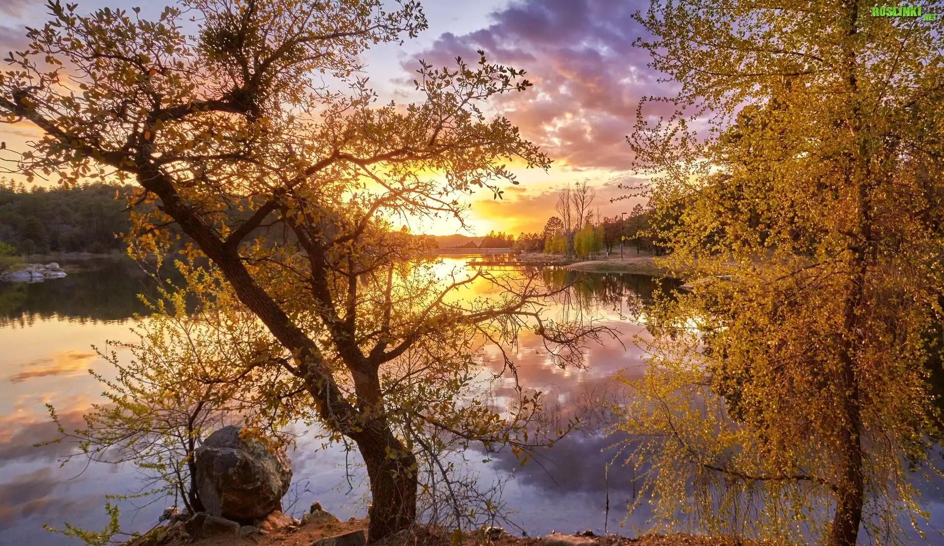 Rośliny: Jesień, Rzeka, Drzewa, Zachód słońca