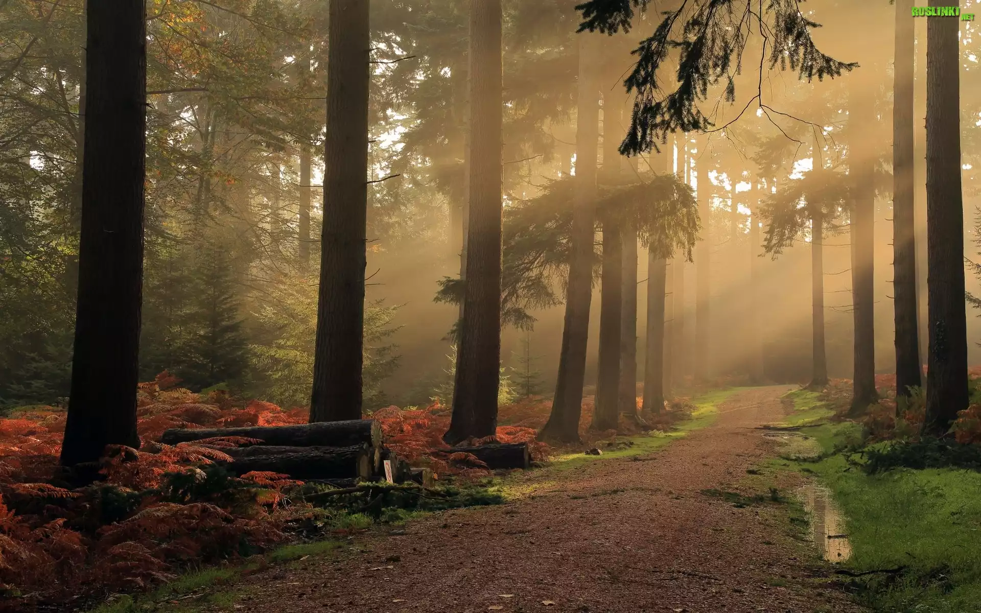 Rośliny: Jesień, Las, Droga, Przebijające światło, Drzewa, Paprocie, Kałuże, Zawalone, Pnie