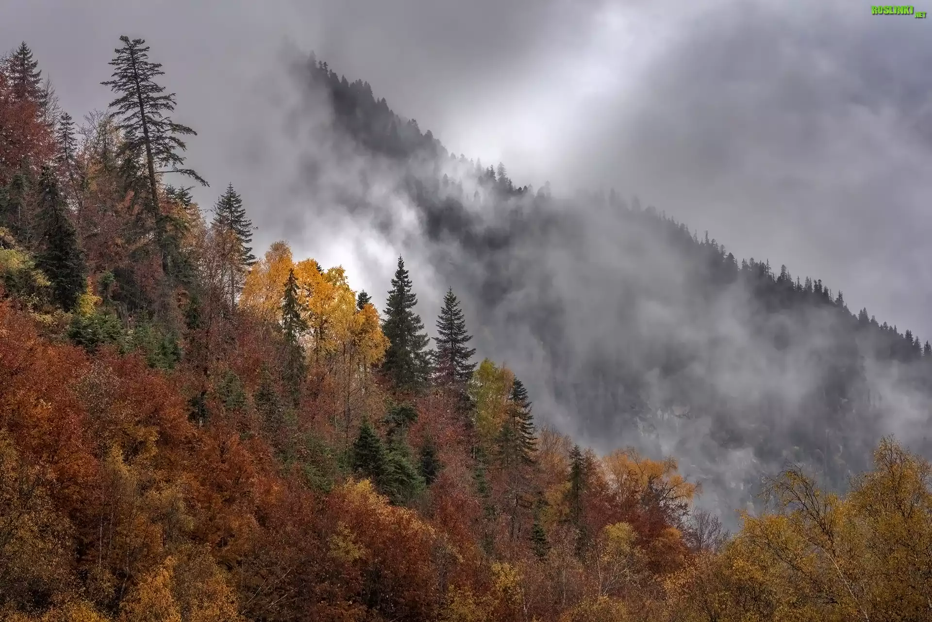 Rośliny: Jesień, Drzewa, Mgła, Zbocze, Góry
