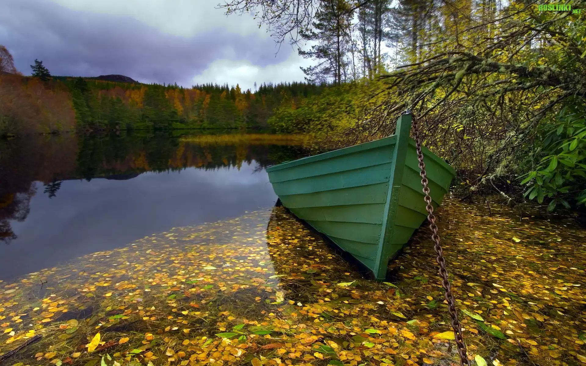 Rośliny: Jesień, Jezioro, Drzewa, Liście, Zielona, Łódź