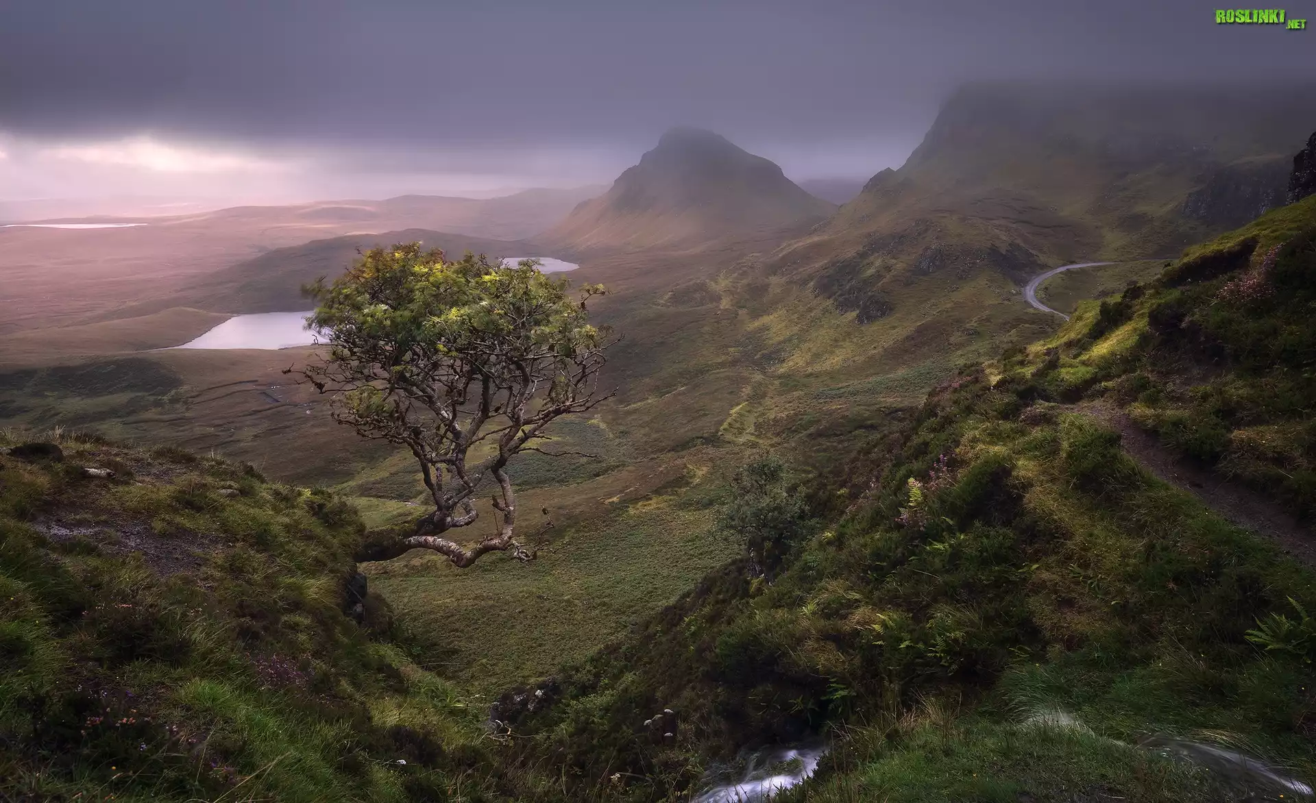 Rośliny: Góry, Jeziora, Mgła, Rośliny, Drzewo, Wyspa Skye, Szkocja