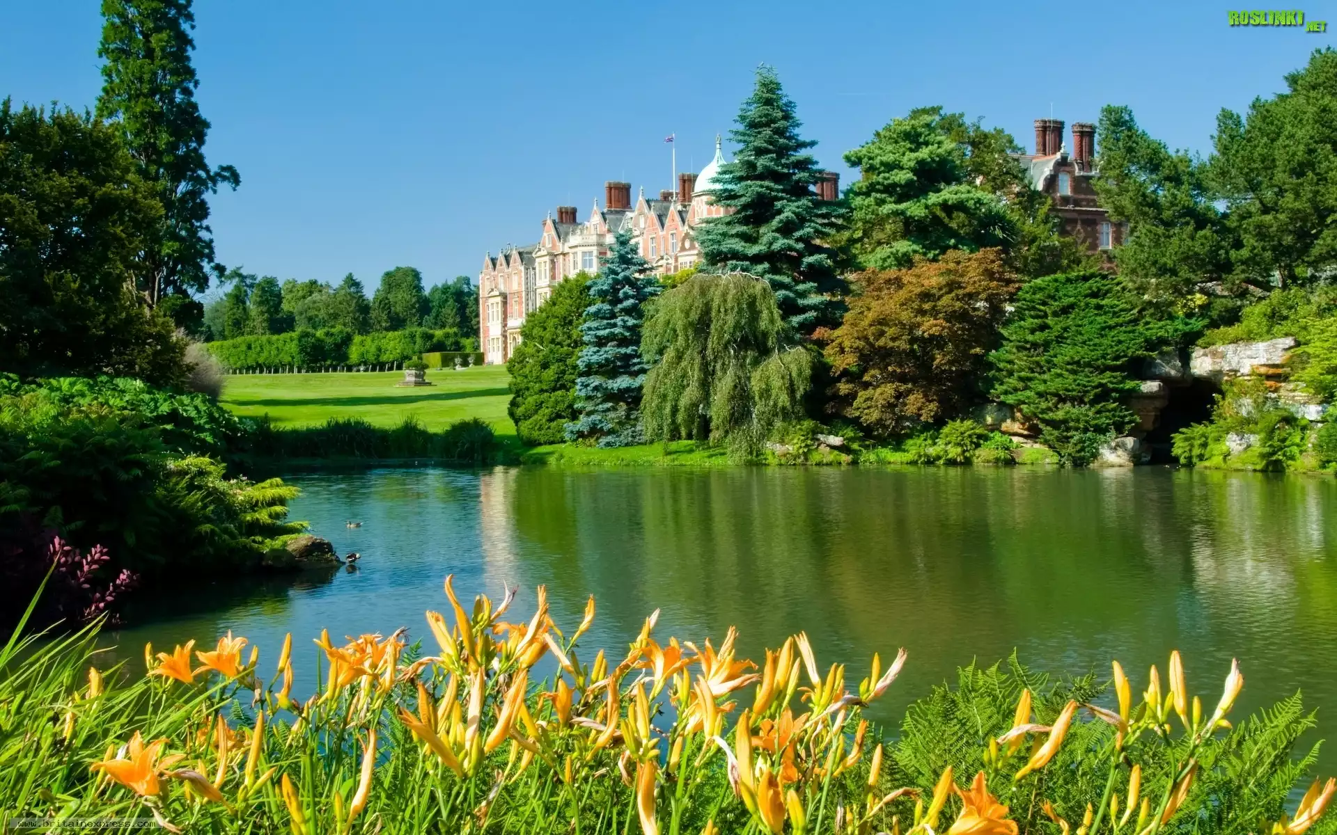 Rośliny: Jeziorko, Kwiatki, Drzewa, Pałac, Sandringham, Anglia