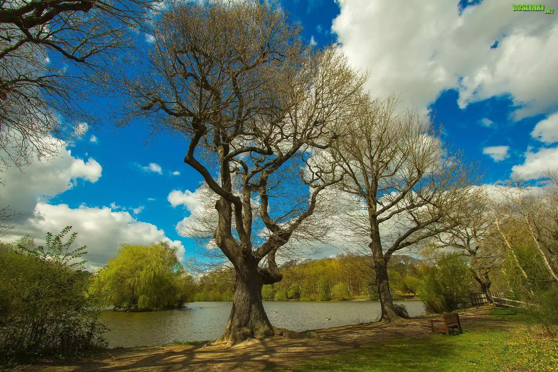Rośliny: Jezioro, Wiosna, Drzewa, Ławka, Chmury