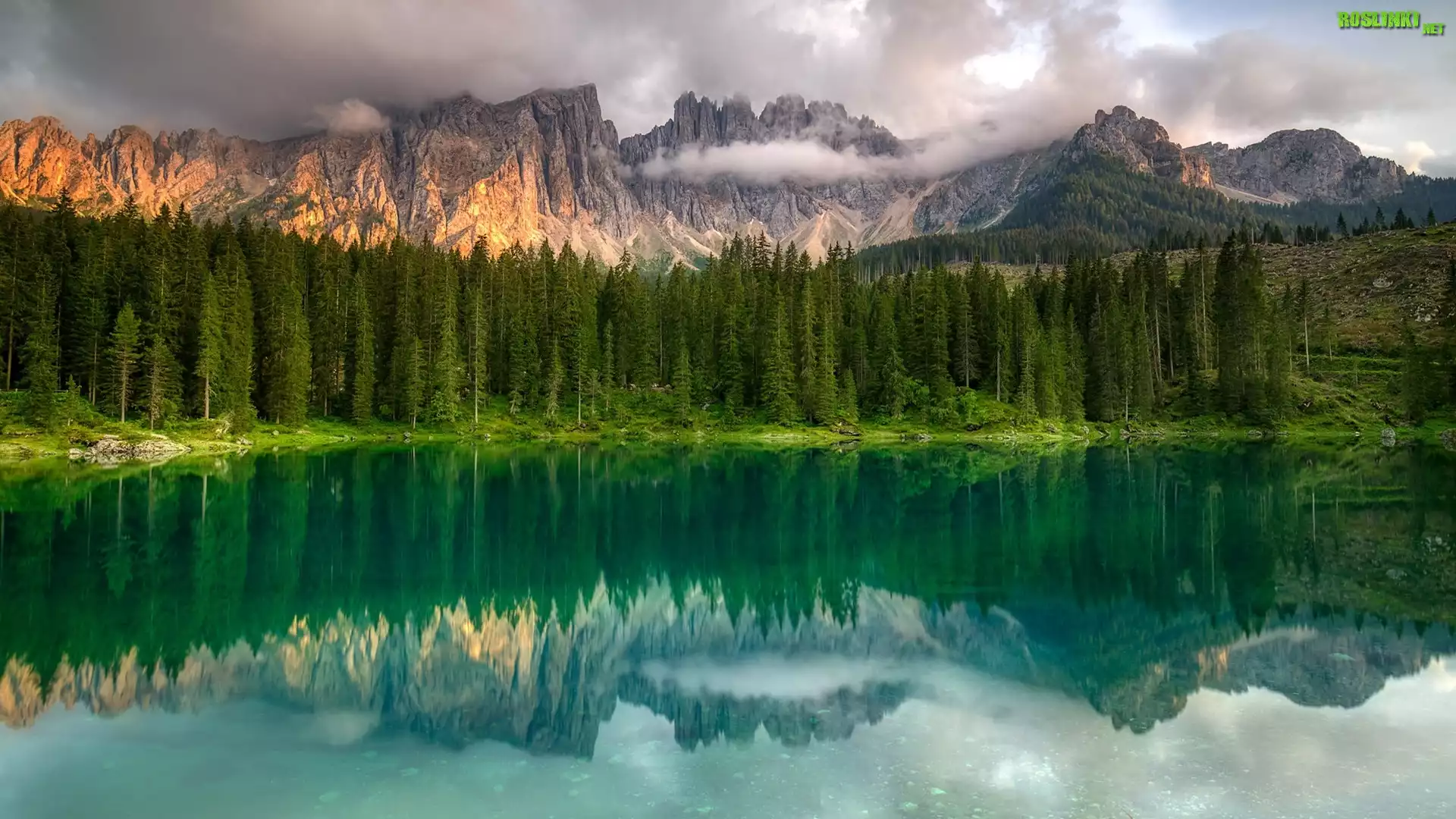 Rośliny: Jezioro, Lago di Carezza, Góry, Alpy, Dolomity, Las, Drzewa, Chmury, Południowy Tyrol, Włochy