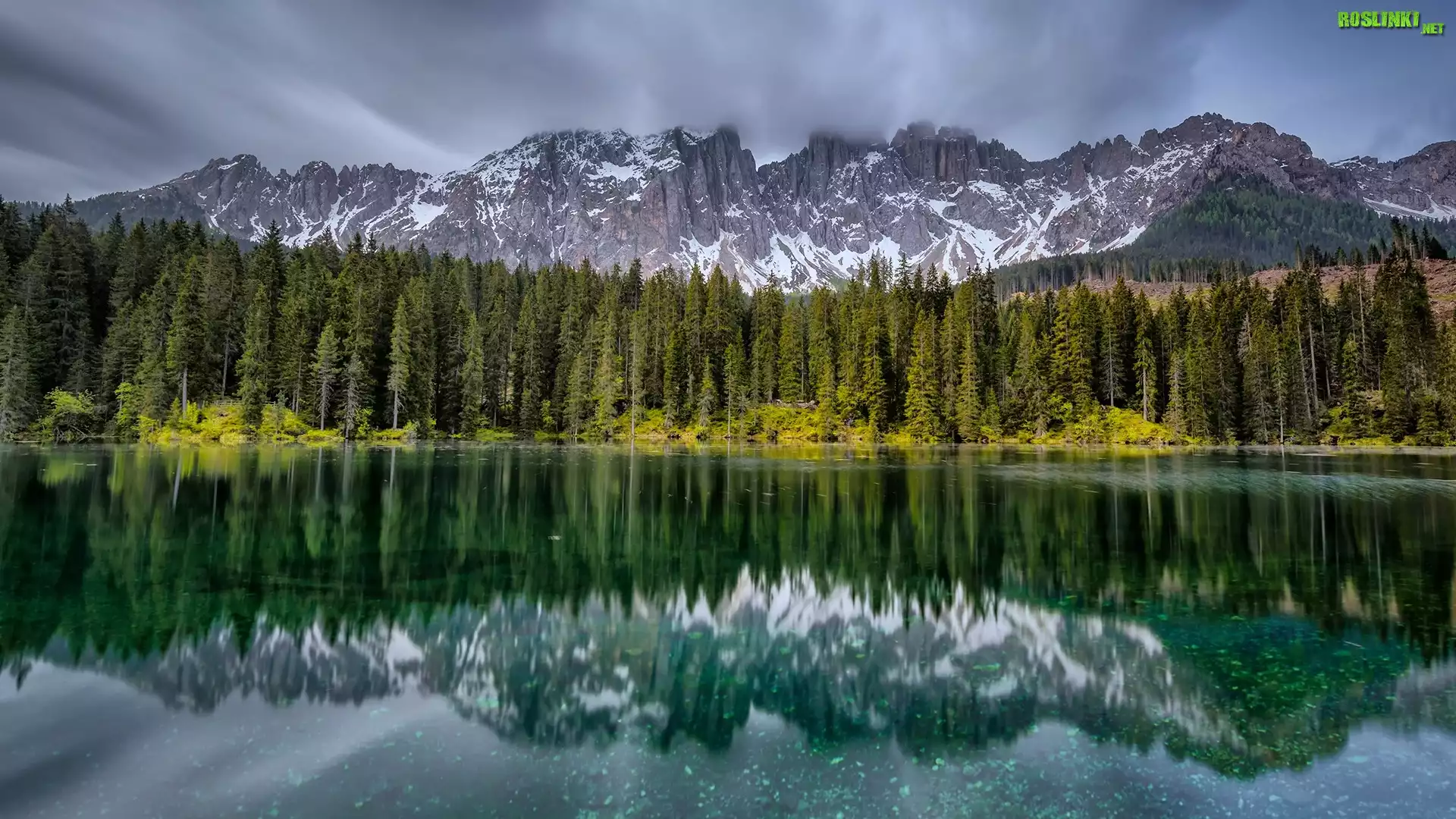 Rośliny: Jezioro, Lago di Carezza, Góry, Alpy, Dolomity, Las, Drzewa, Odbicie, Południowy Tyrol, Włochy