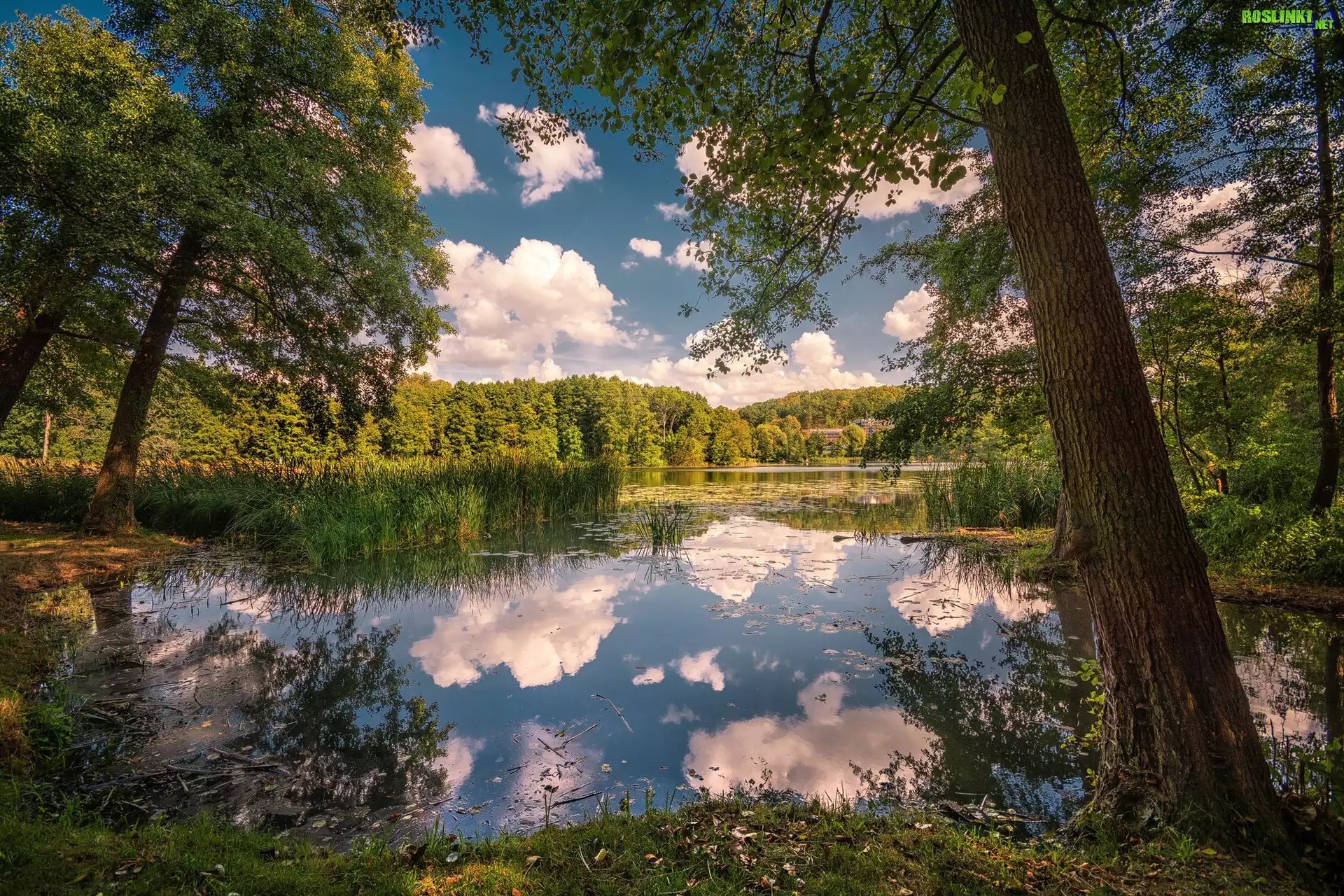 Rośliny: Jezioro, Trawy, Drzewa, Roślinność, Chmury, Odbicie