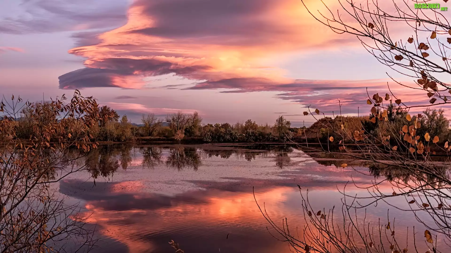 Rośliny: Jezioro, Drzewa, Zachód słońca, Chmury, Odbicie
