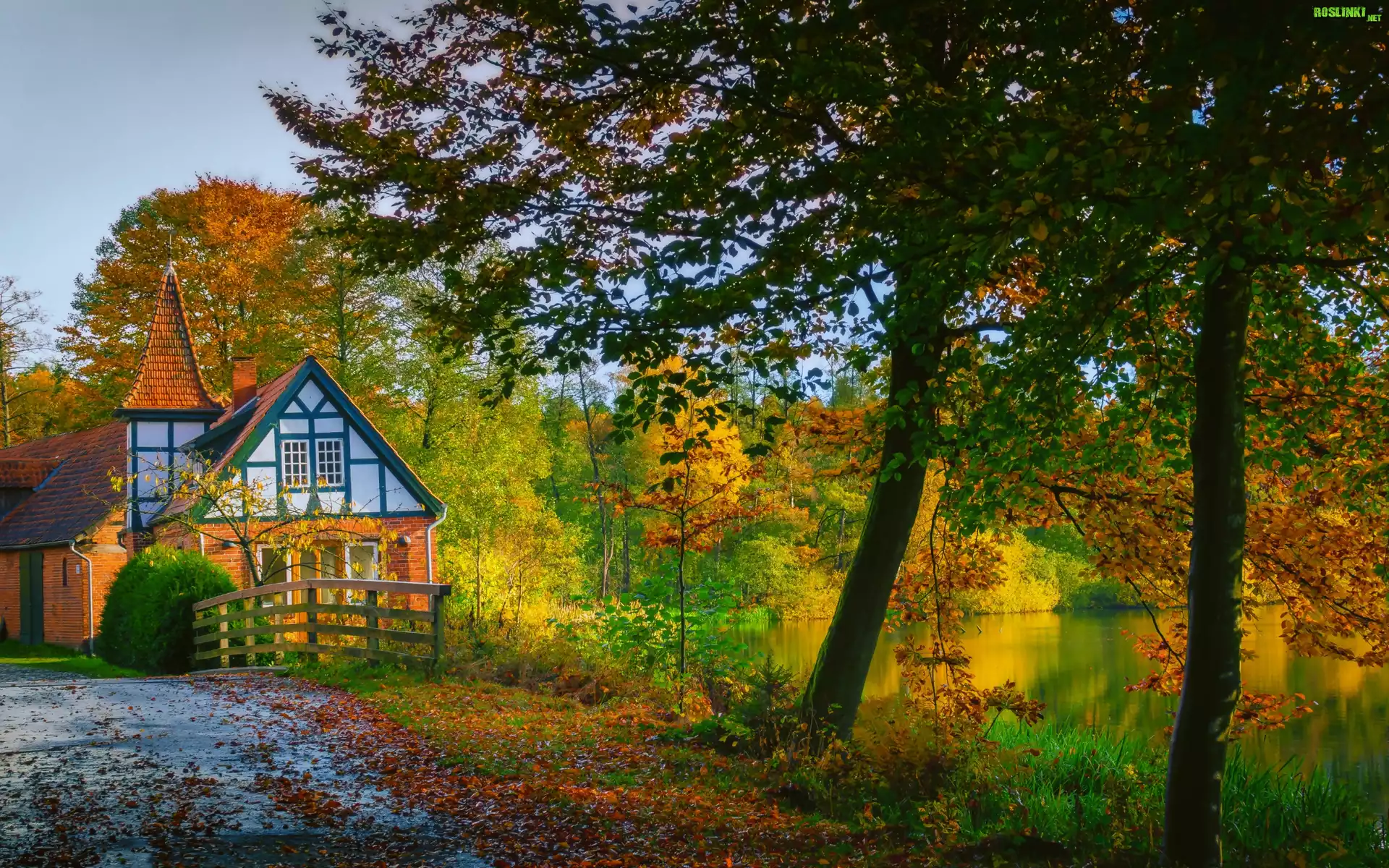 Rośliny: Jezioro, Drzewa, Dom, Jesień