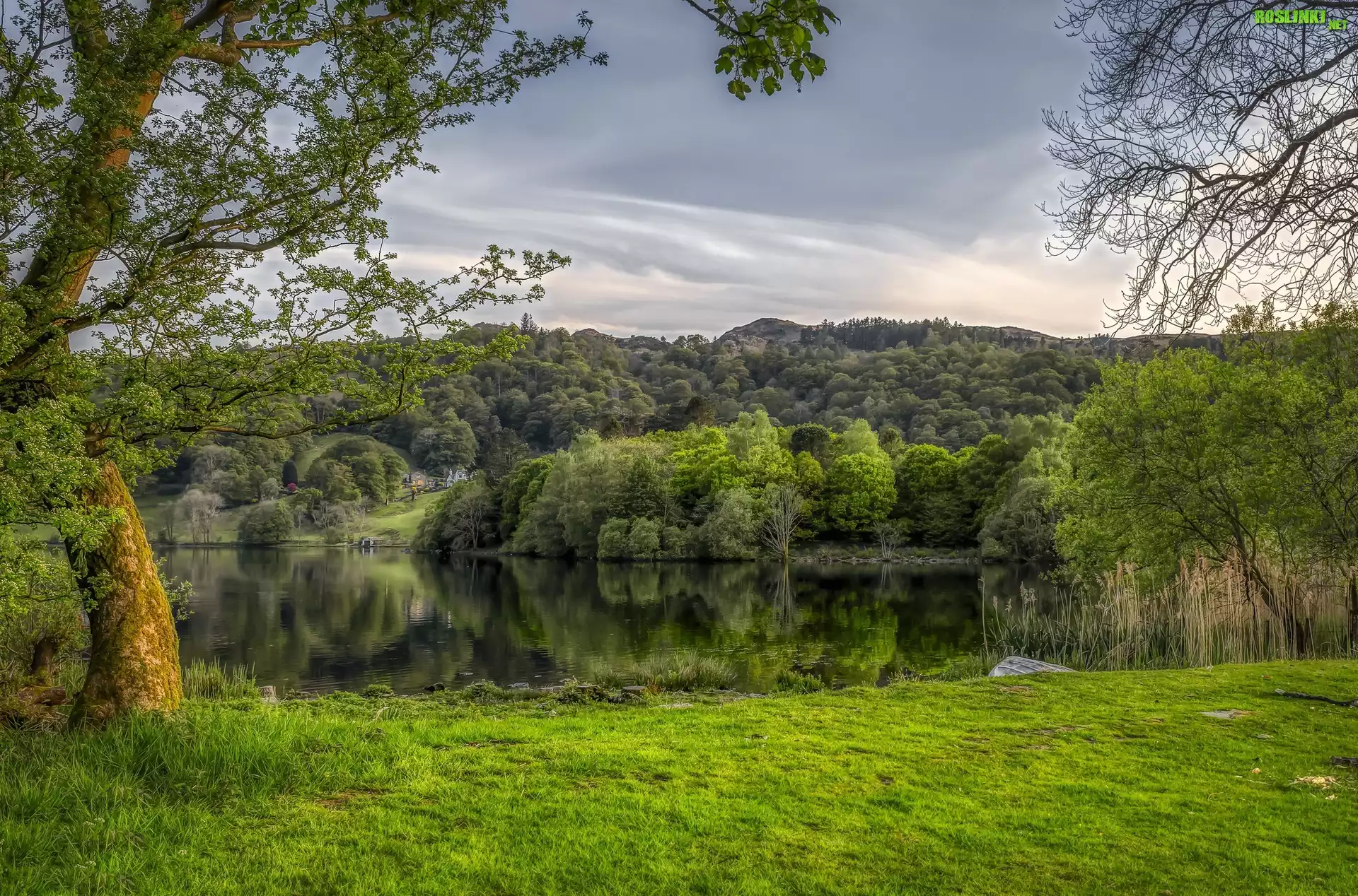 Rośliny: Jezioro, Drzewa, Domy, Wiosna