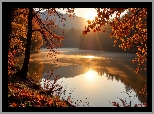 Jesień, Jezioro, Drzewa, Słoneczny blask
