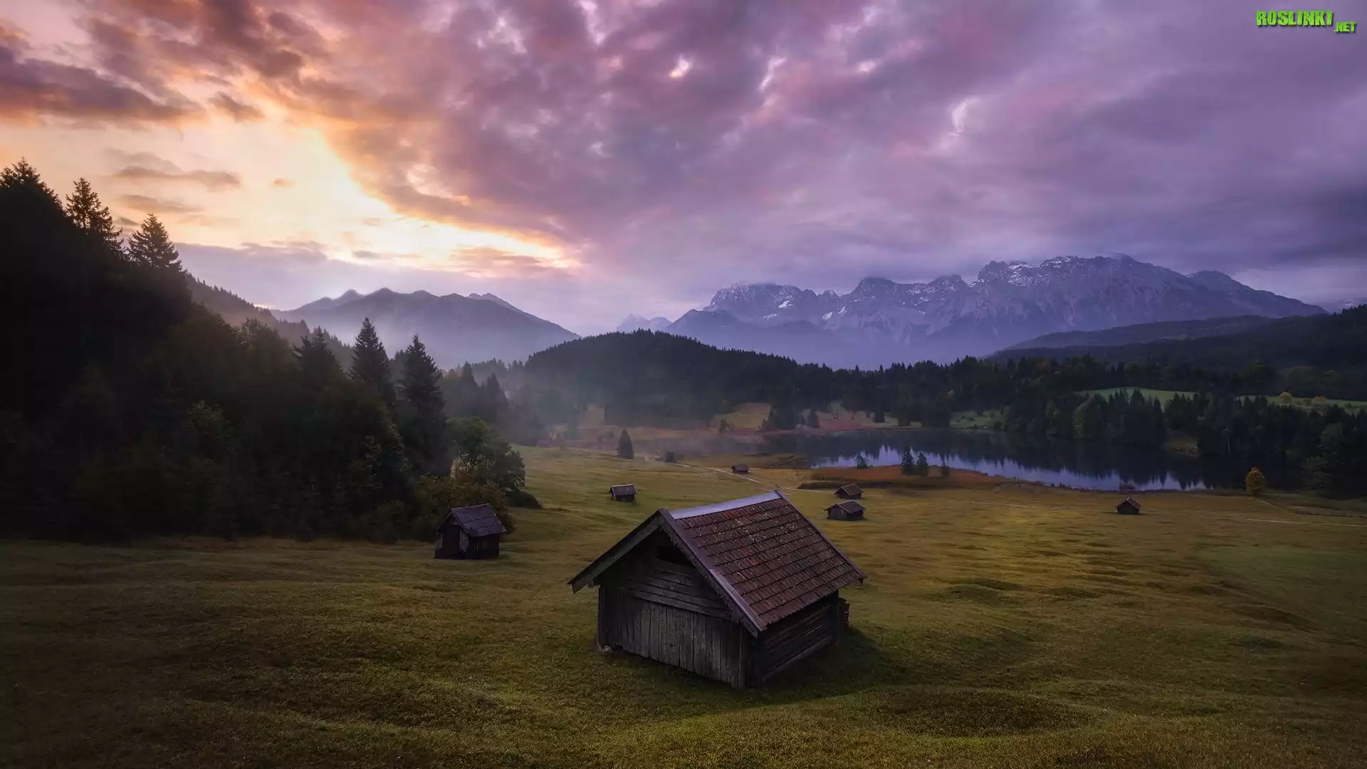 Rośliny: Drewniane, Domki, Jezioro Geroldsee, Drzewa, Lasy, Góry, Alpy, Chmury, Bawaria, Niemcy