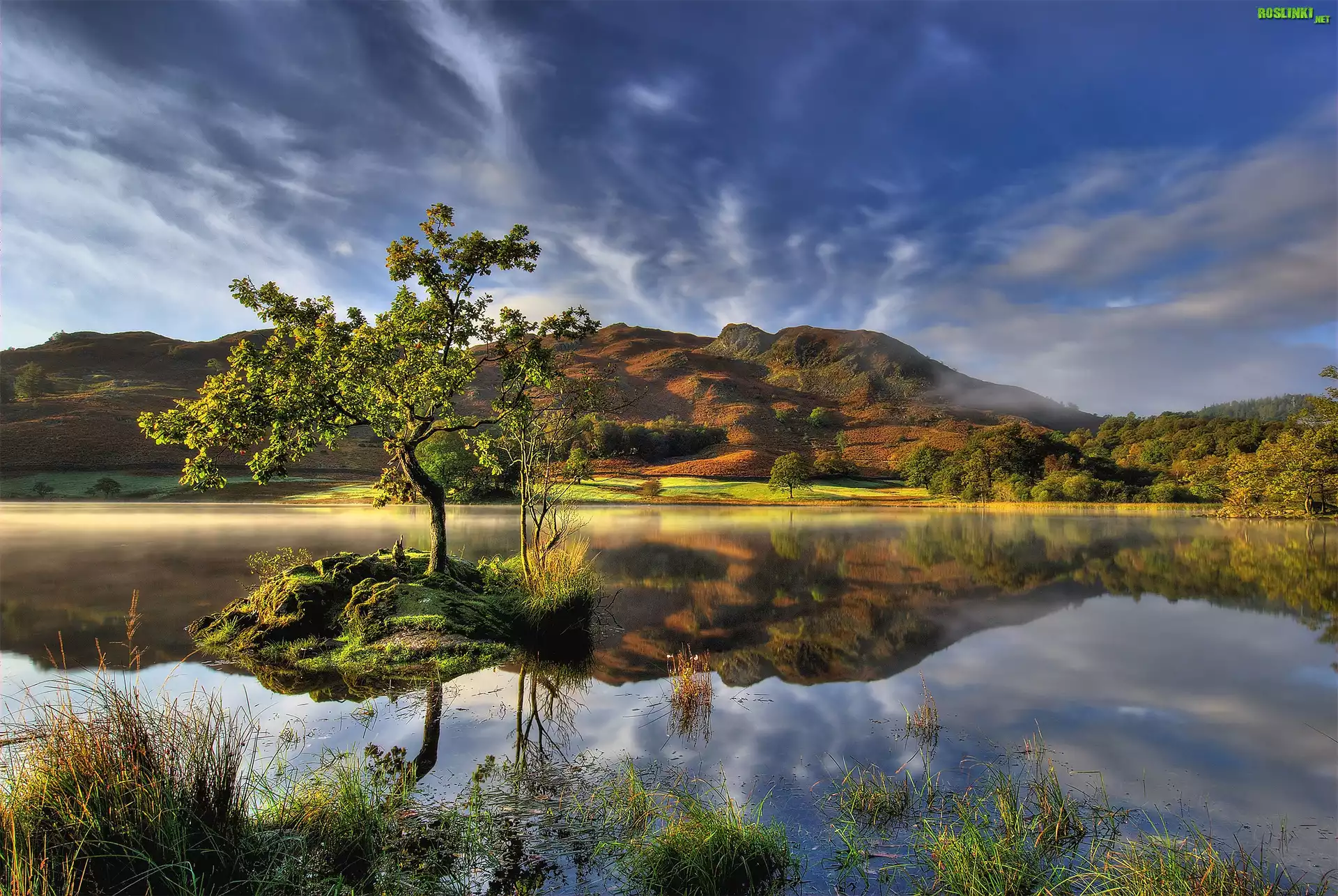 Rośliny: Jezioro, Góry, Drzewa, Chmury