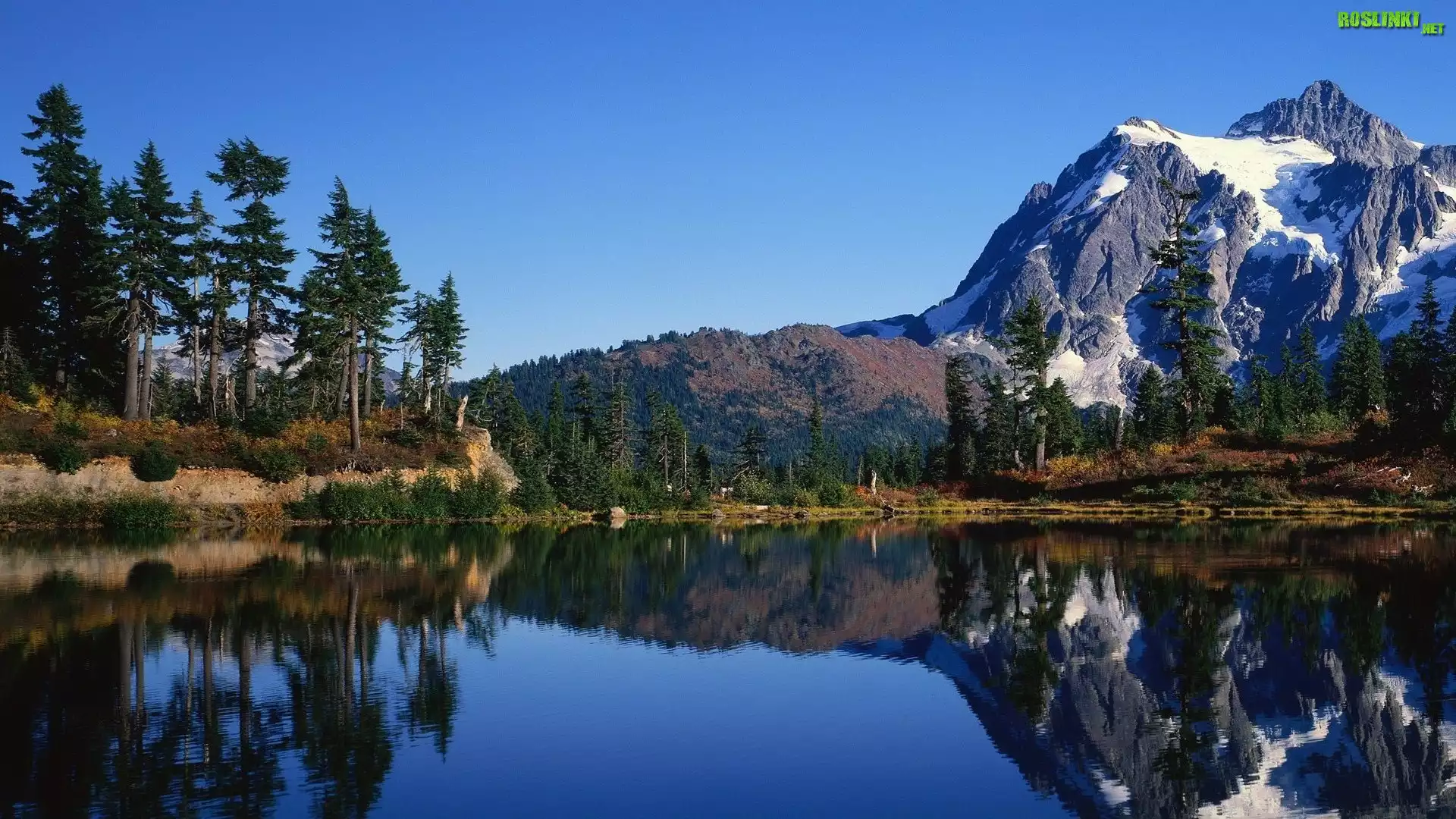 Rośliny: Jezioro, Ośnieżone, Góry, Drzewa, Iglaki