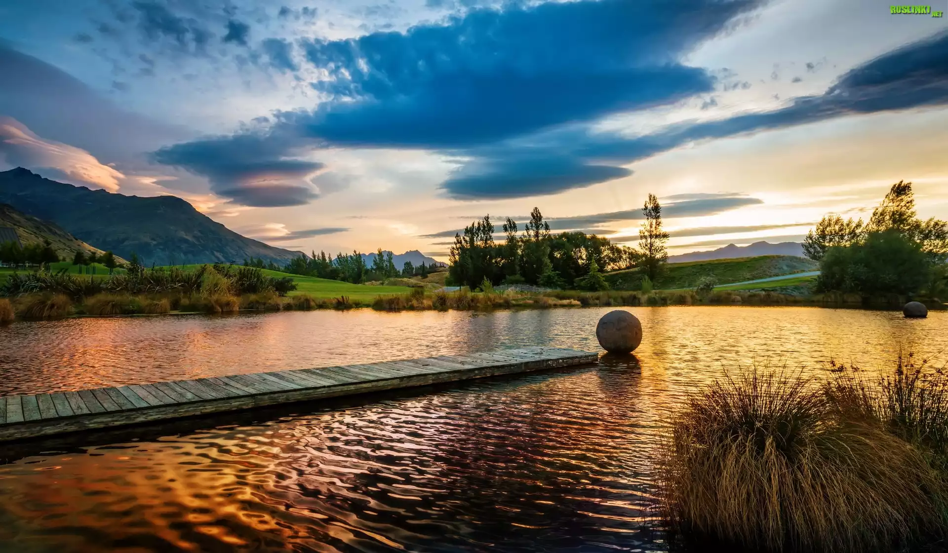 Rośliny: Jezioro, Molo, Drzewa, Góry