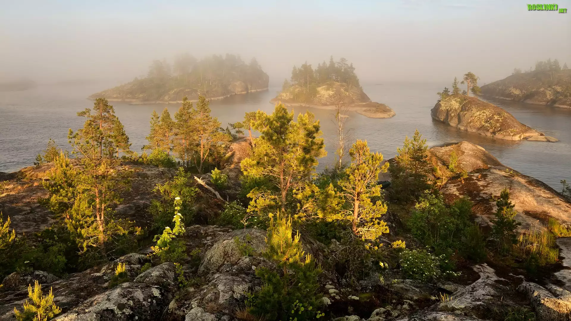 Rośliny: Jezioro, Wysepki, Skały, Drzewa, Mgła
