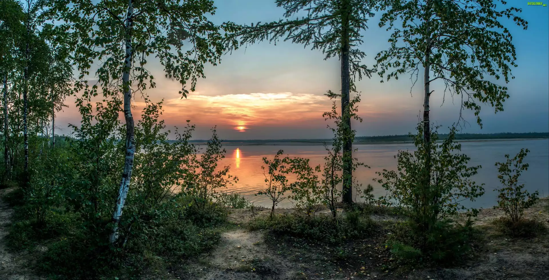 Rośliny: Jezioro, Zachód, Słońca, Drzewa, Brzozy
