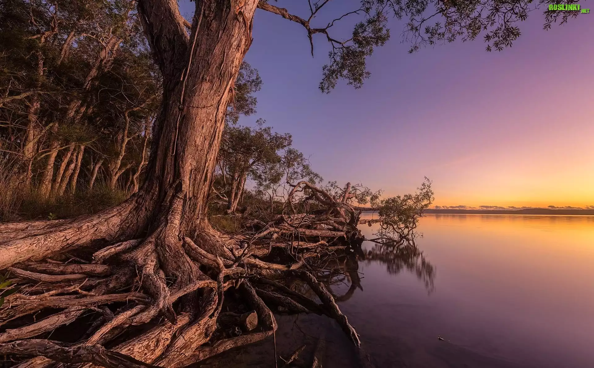 Jezioro, Zachód słońca, Drzewa, Korzenie