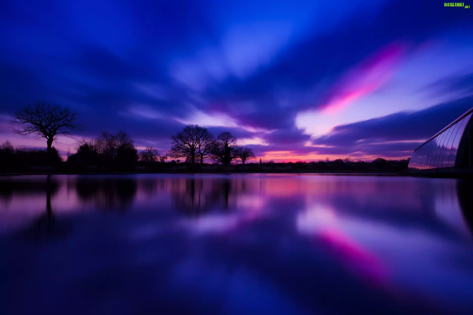 Rośliny: Jezioro, Zachód, Słońca, Drzewa, Niebo