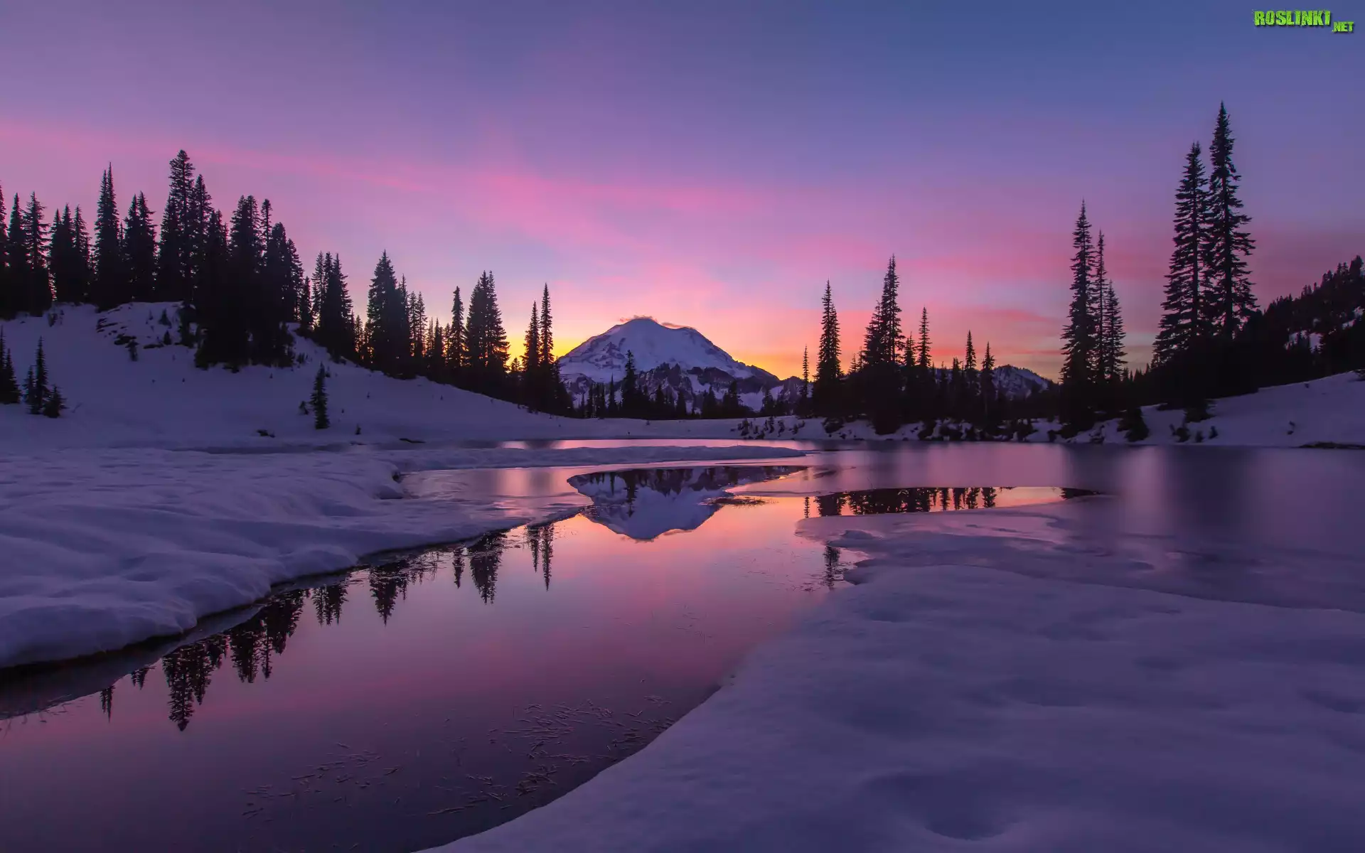 Rośliny: Góry, Śnieg, Drzewa, Jezioro, Zima, Zachód słońca