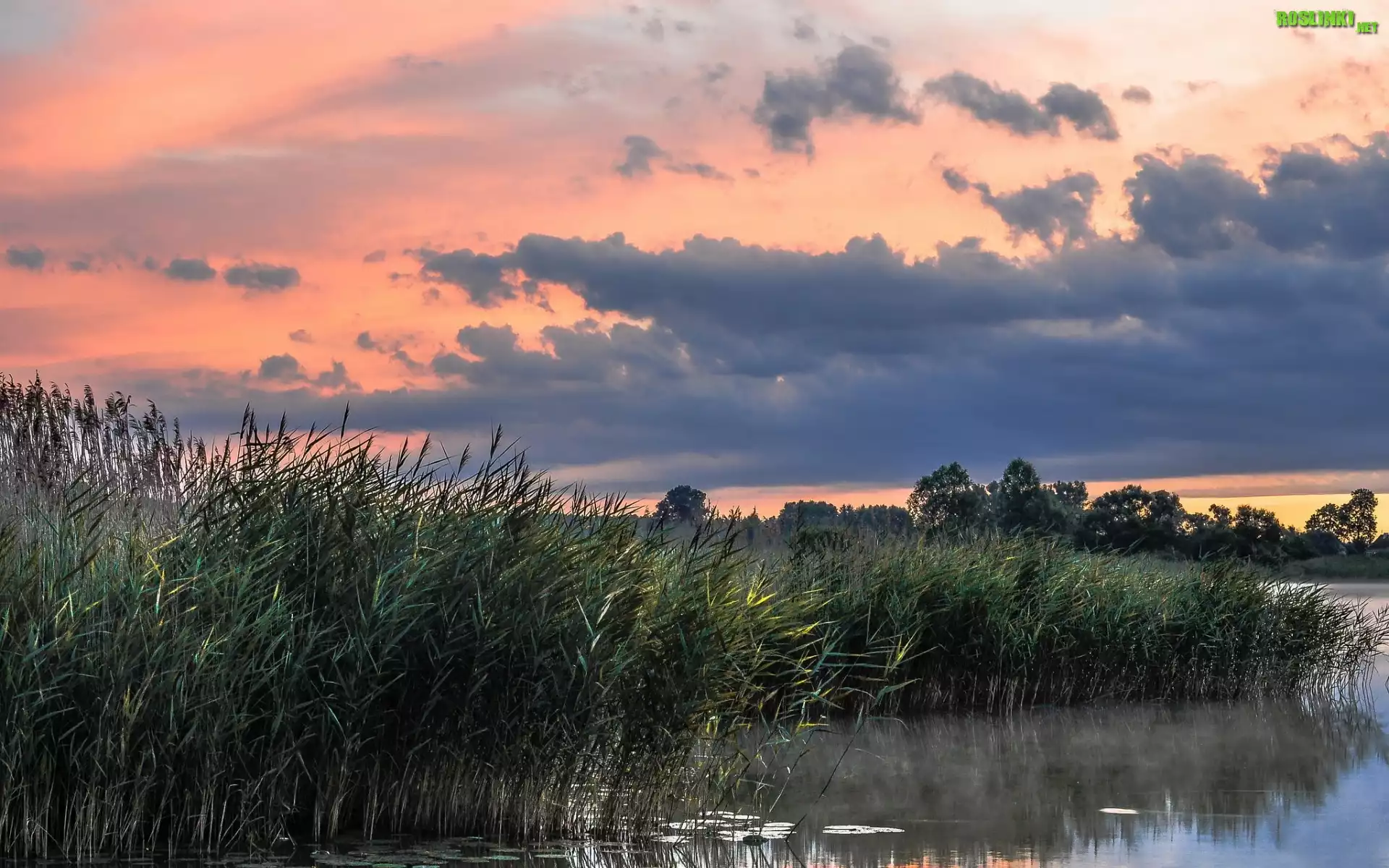 Rośliny: Jezioro, Szuwary, Drzewa, Chmury