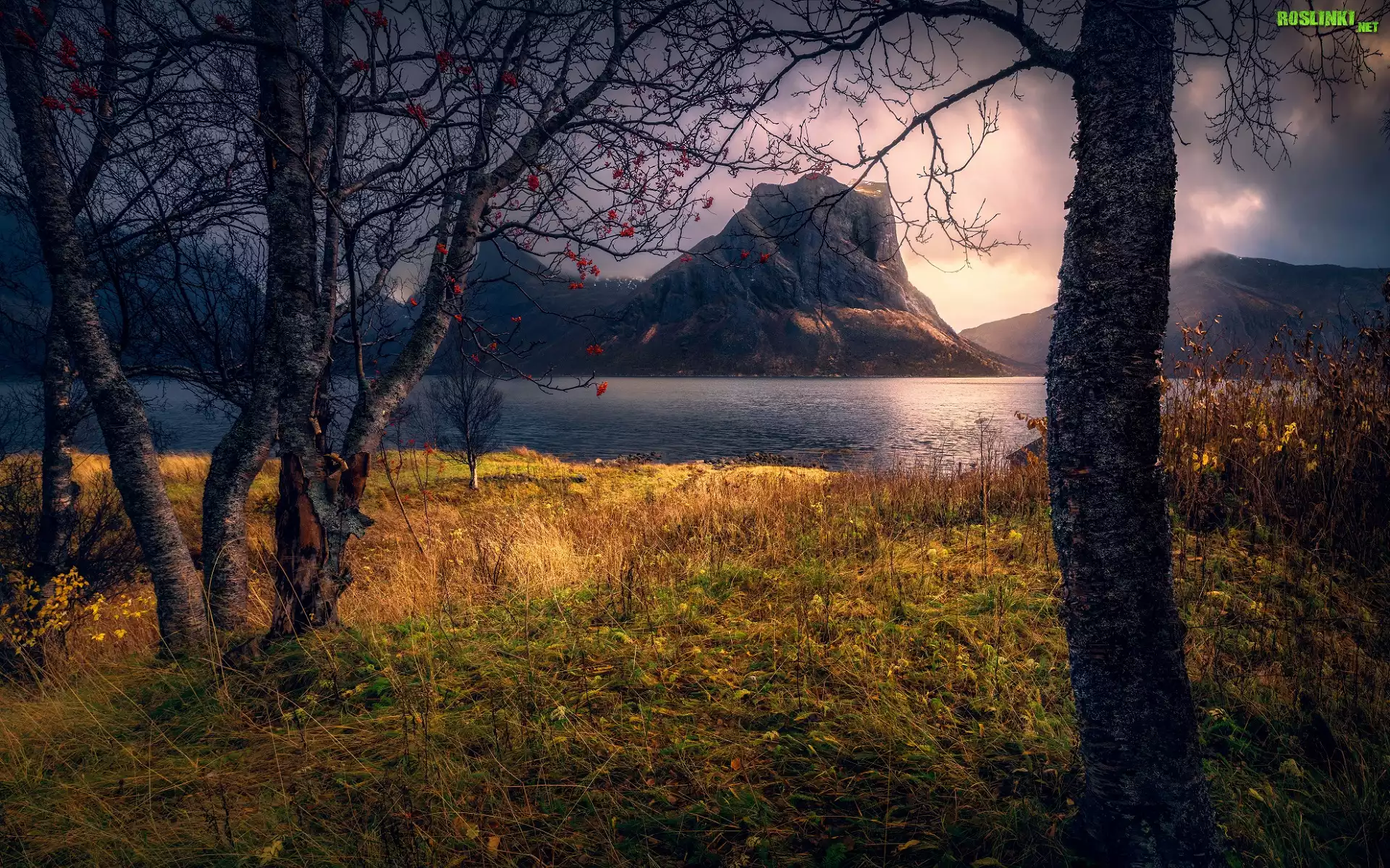 Rośliny: Góry, Jezioro, Drzewa, Pożółkła, Trawa