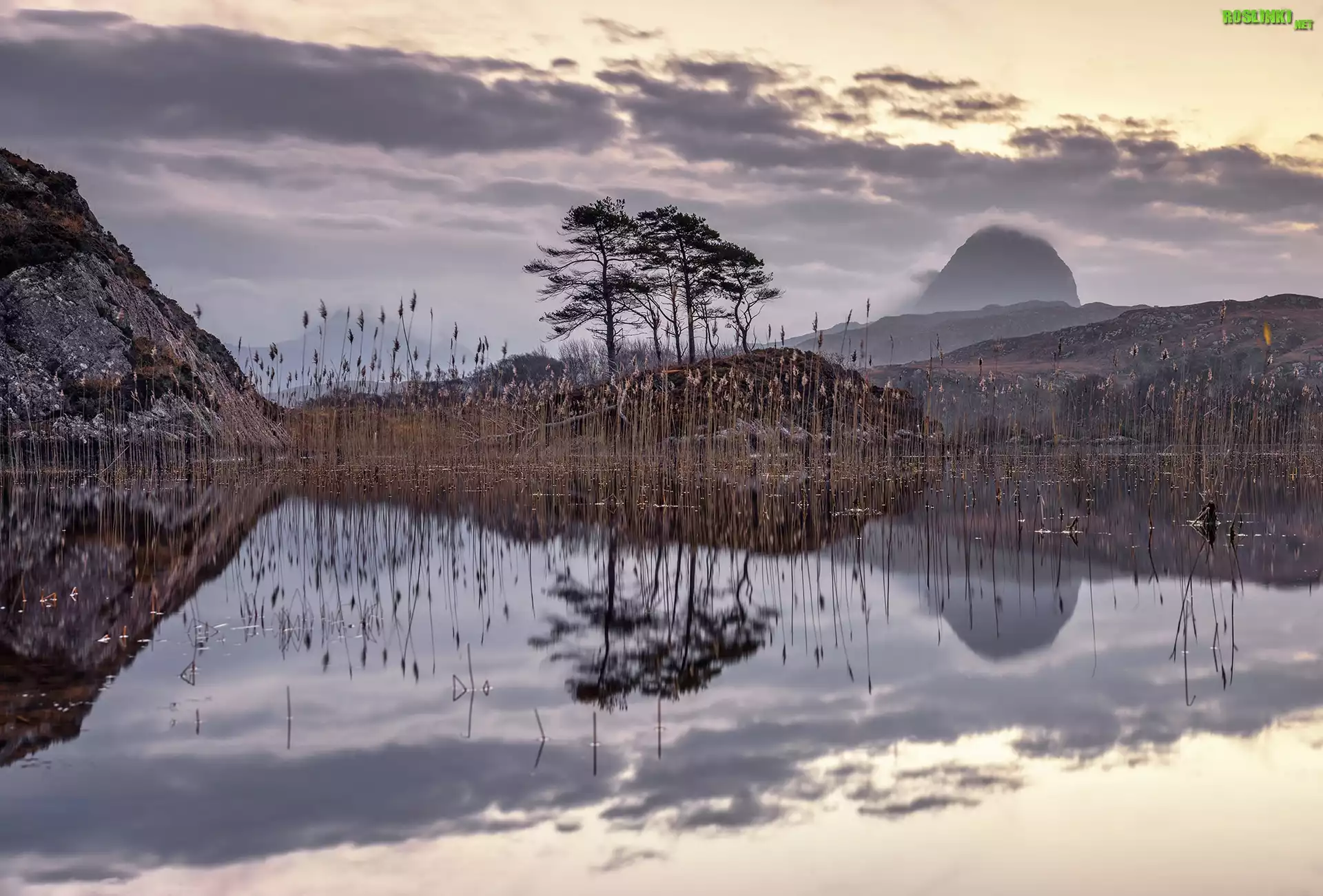 Rośliny: Jezioro, Szuwary, Trawa, Wzgórza, Drzewa, Jesień