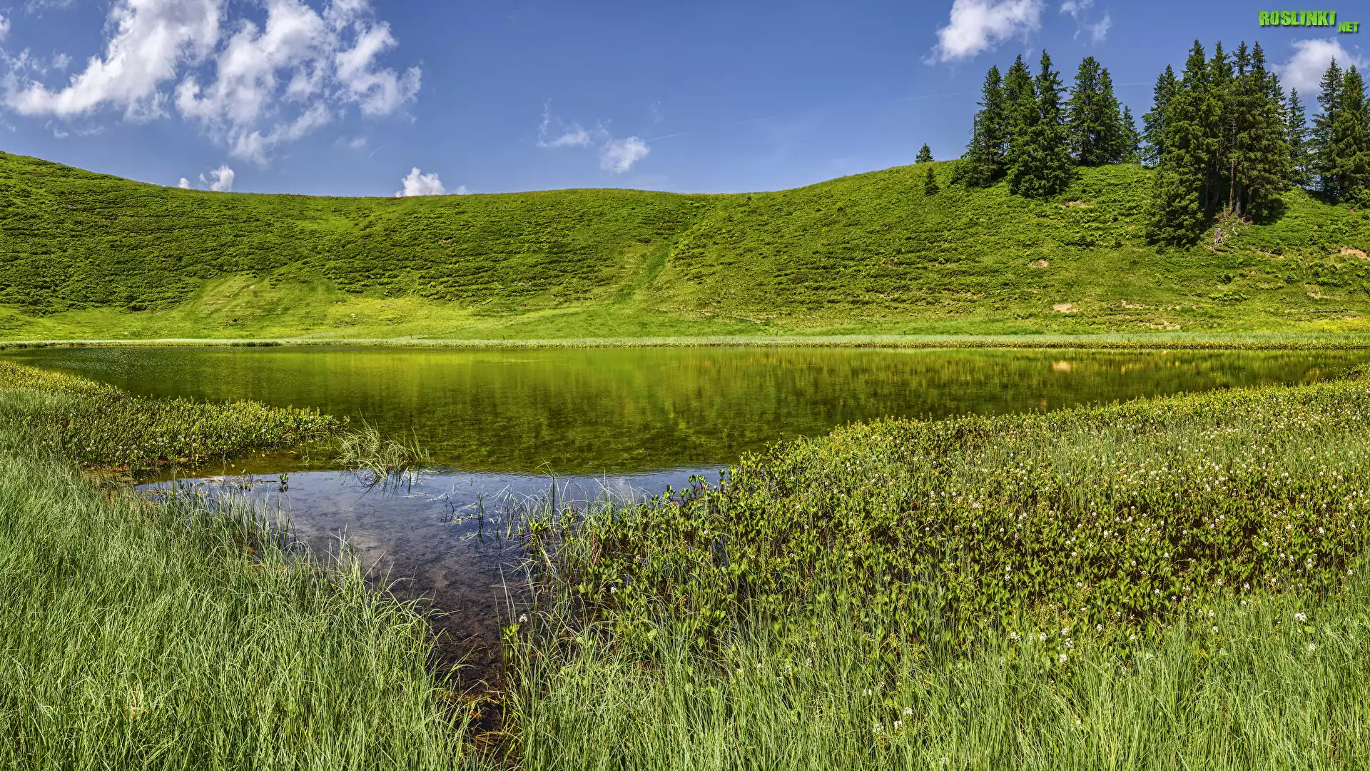Rośliny: Jezioro, Trawa, Drzewa, Wzgórze