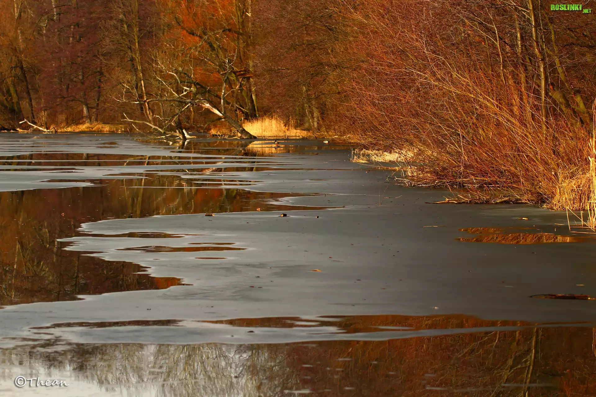 Jezioro, Topniejące, Trawy, Drzewa, Przedwiośnie