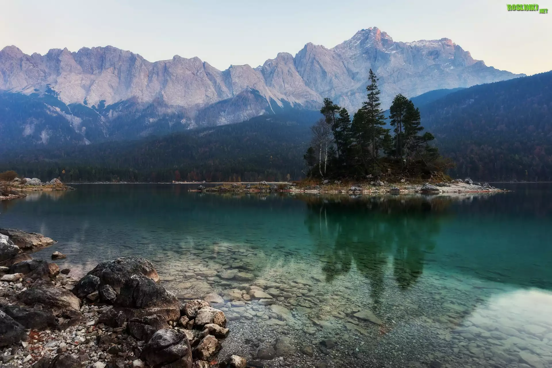 Rośliny: Jezioro, Wyspa, Drzewa, Góry