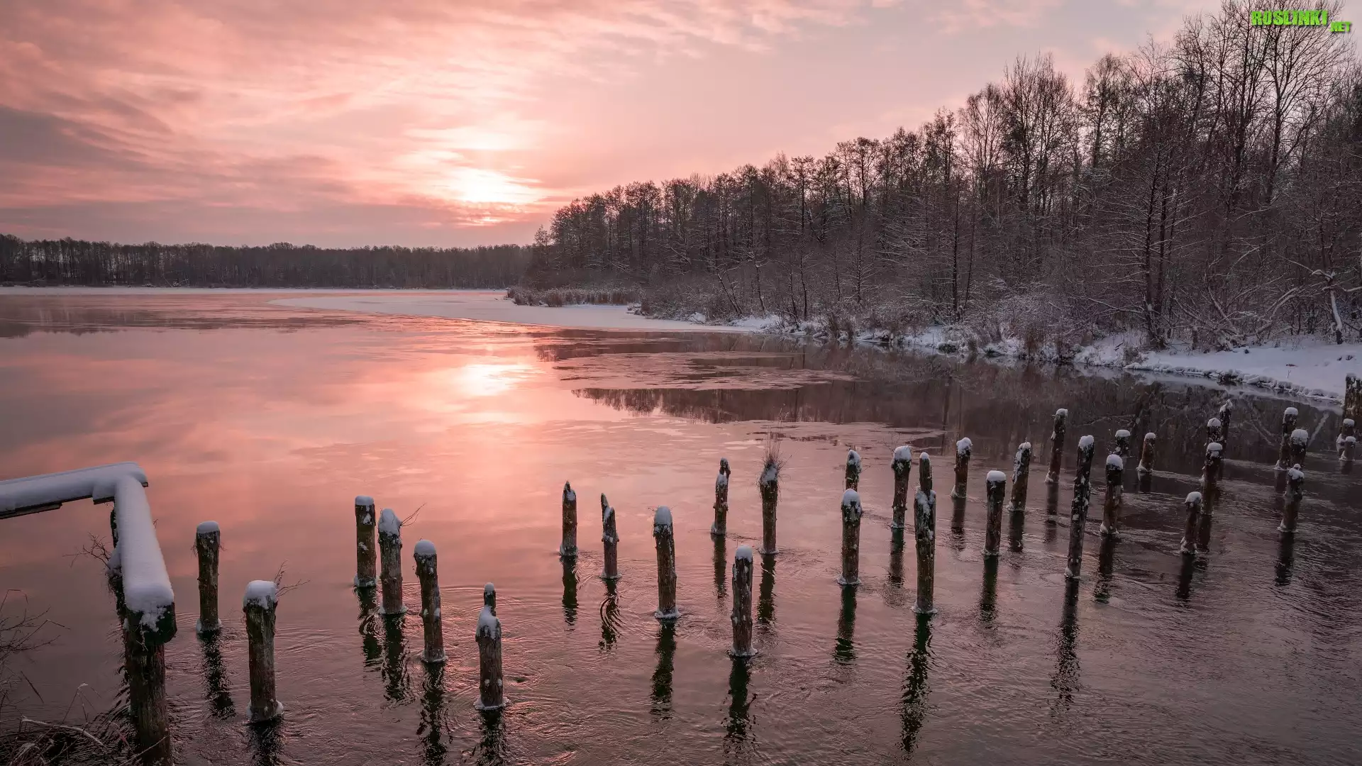 Rośliny: Jezioro, Zima, Drzewa, Pale