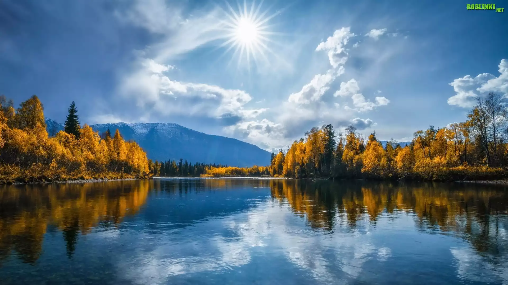 Jesień, Żółte, Drzewa, Jezioro, Odbicie, Promienie słońca