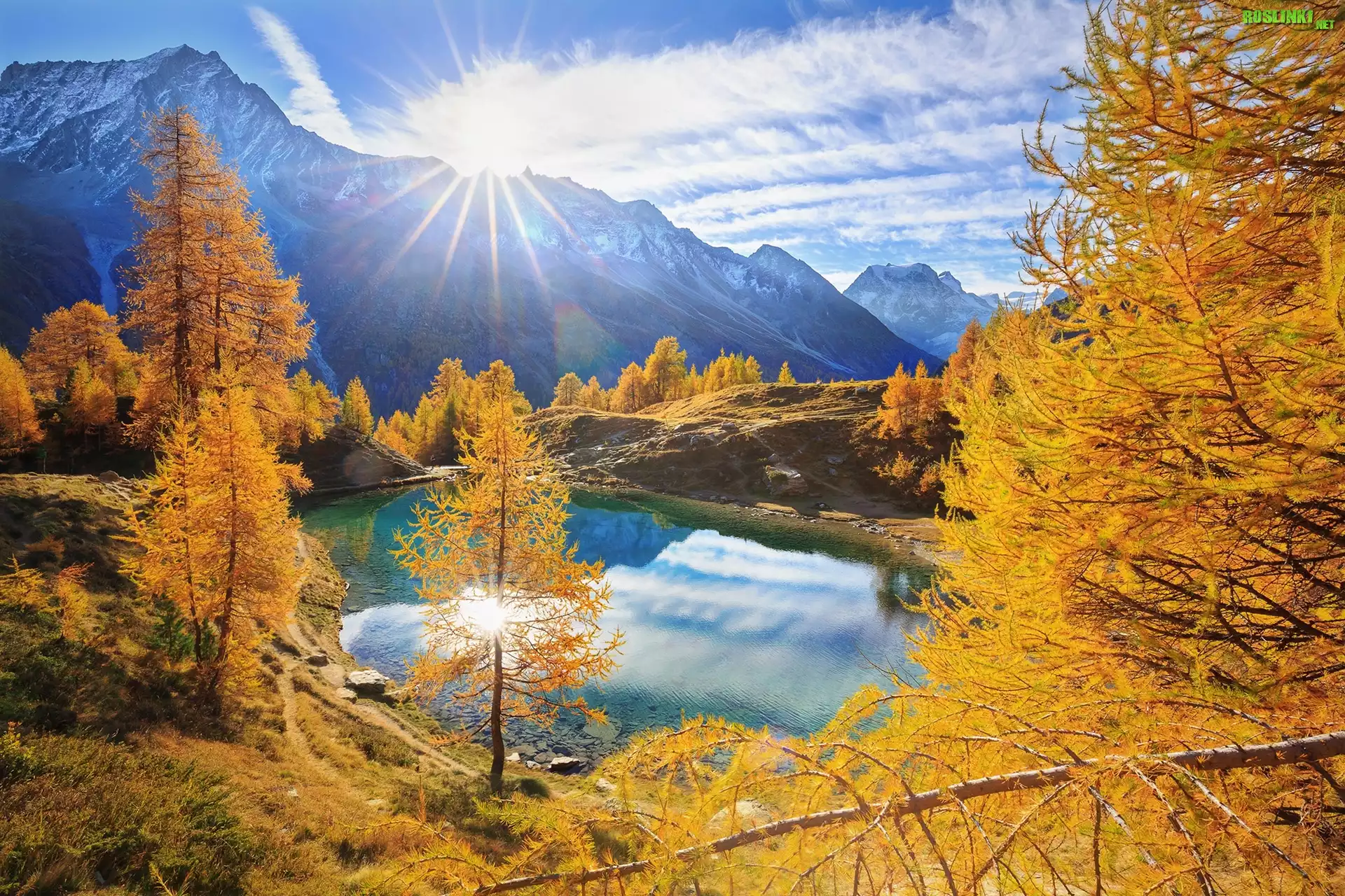 Rośliny: Góry, Jezioro, Drzewa, Jesień, Promienie słońca, Chmury