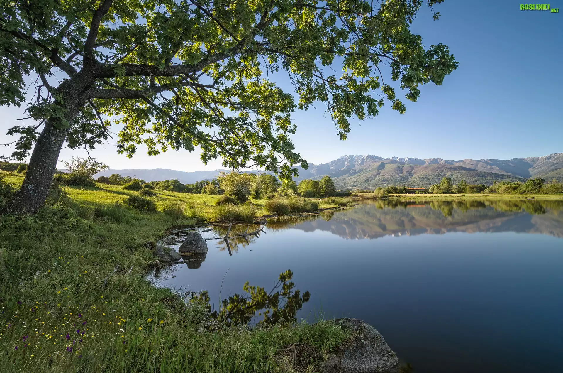 Rośliny: Hiszpania, Jezioro, Zbiornik Embalse de Rosarito, Drzewa, Góry