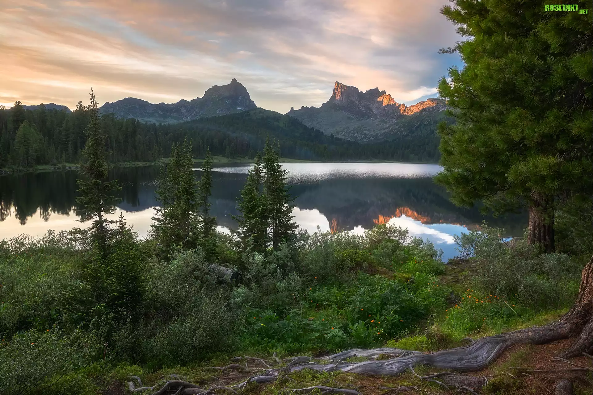 Rośliny: Góry, Jezioro, Las, Drzewa, Roślinność, Chmury, Odbicie