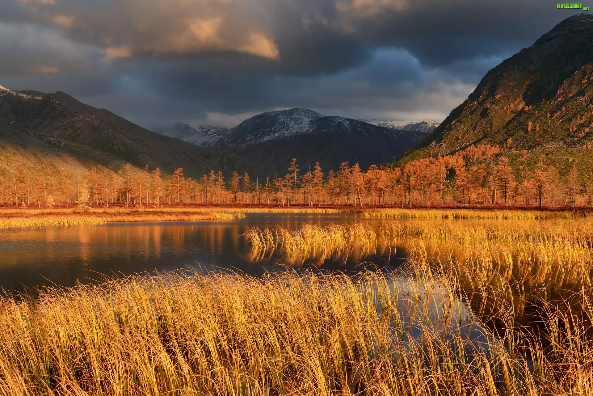 Rośliny: Góry Kołymskie, Drzewa, Krzewy, Trawa, Jezioro, Chmury, Jesień, Kołyma, Obwód magadański, Rosja