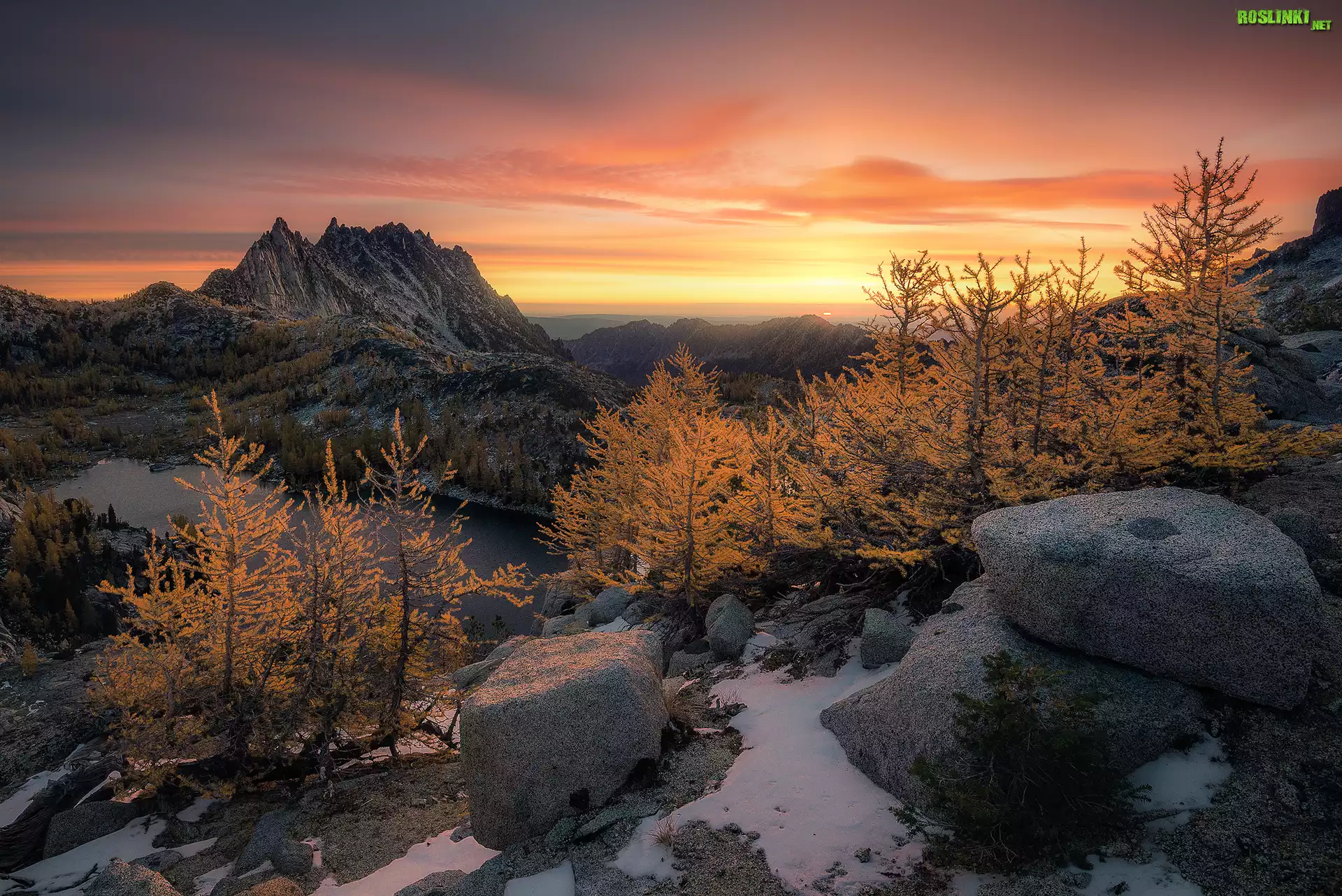 Rośliny: Góry, Jezioro, Skały, Kamienie, Drzewa, Zachód słońca