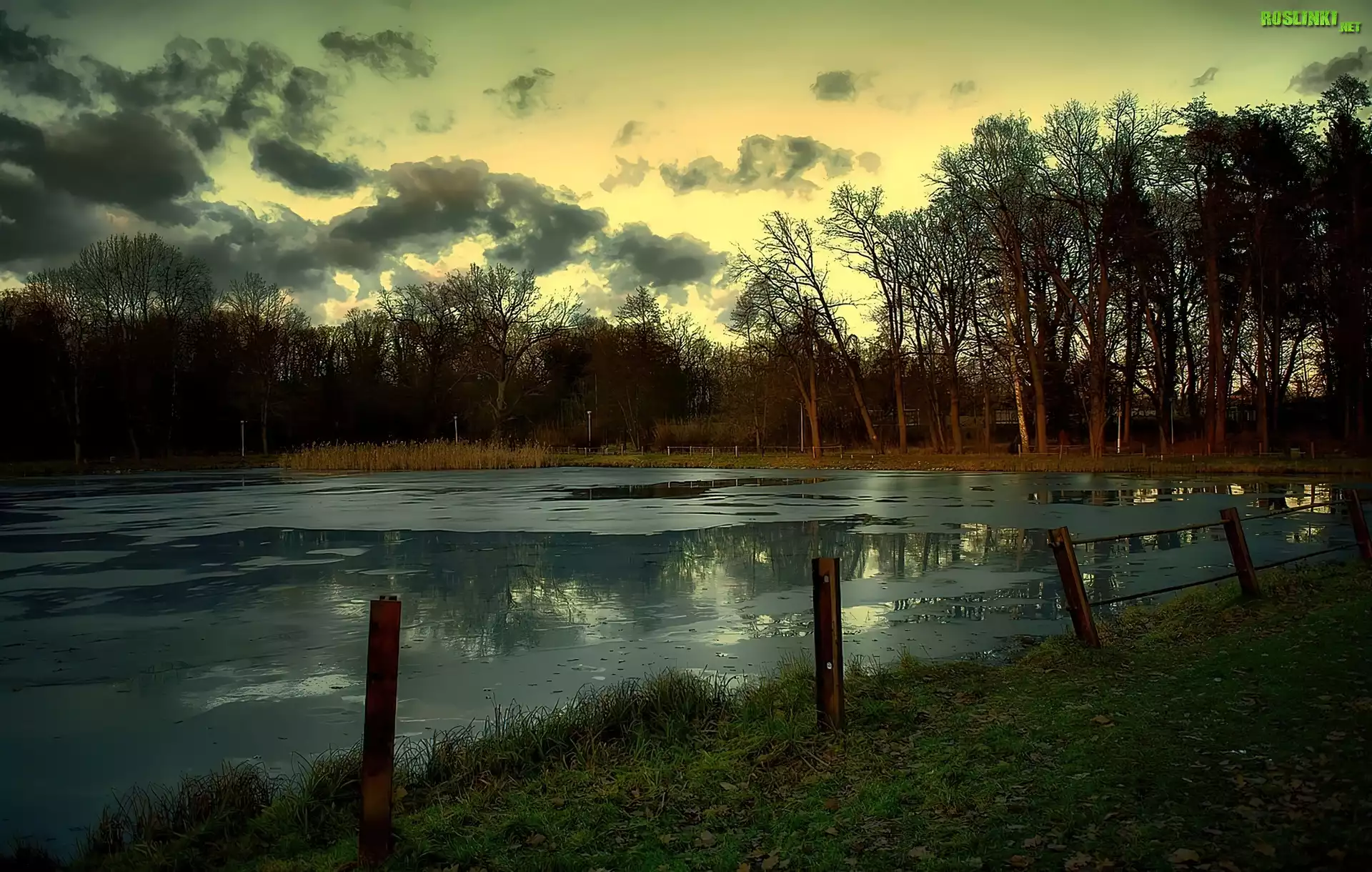 Rośliny: Jezioro, Chmury, Jesień, Drzewa