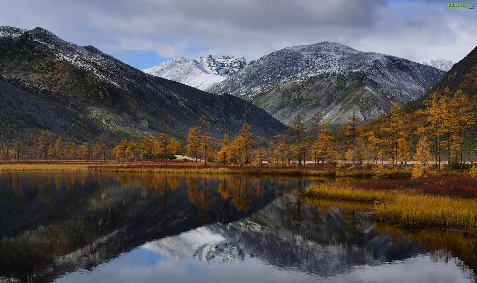 Rośliny: Jesień, Góry Kołymskie, Odbicie, Drzewa, Jezioro Jack London, Kołyma, Obwód magadański, Rosja