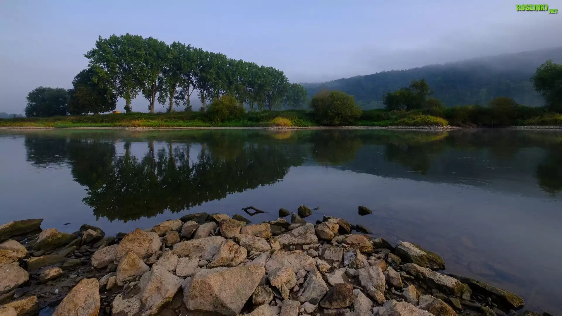 Rośliny: Jezioro, Drzewa, Odbicie, Kamienie, Mgła