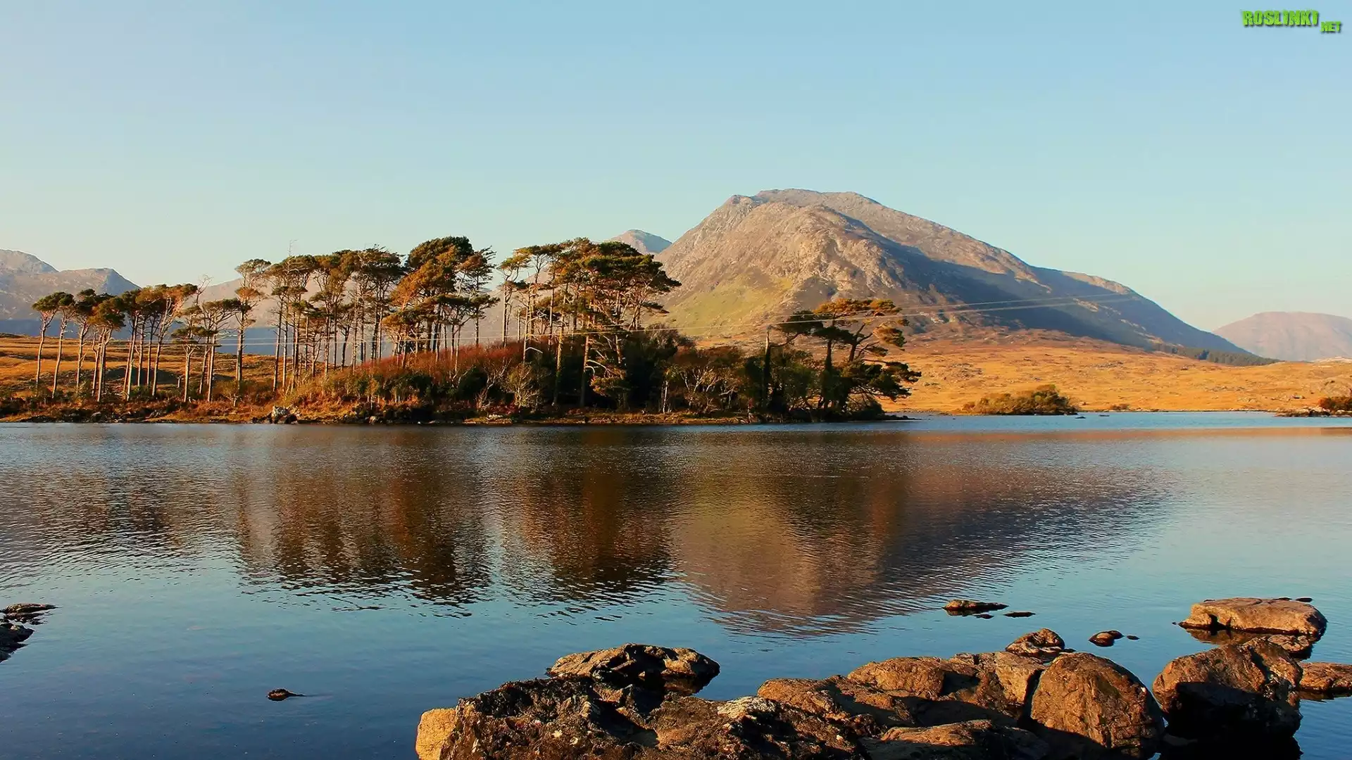 Rośliny: Jezioro, Sosny, Kamienie, Góry