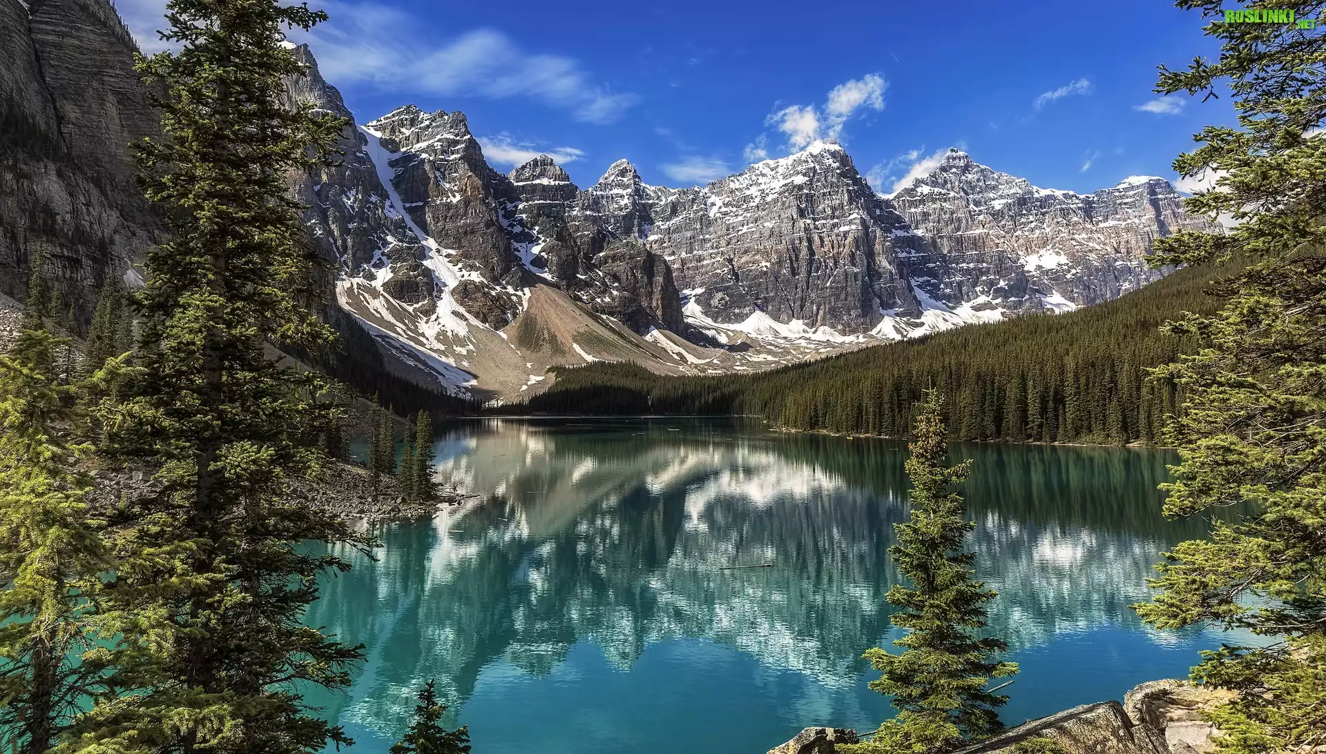 Rośliny: Kanada, Alberta, Park Narodowy Banff, Jezioro Moraine, Las, Drzewa, Góry, Chmury, Odbicie